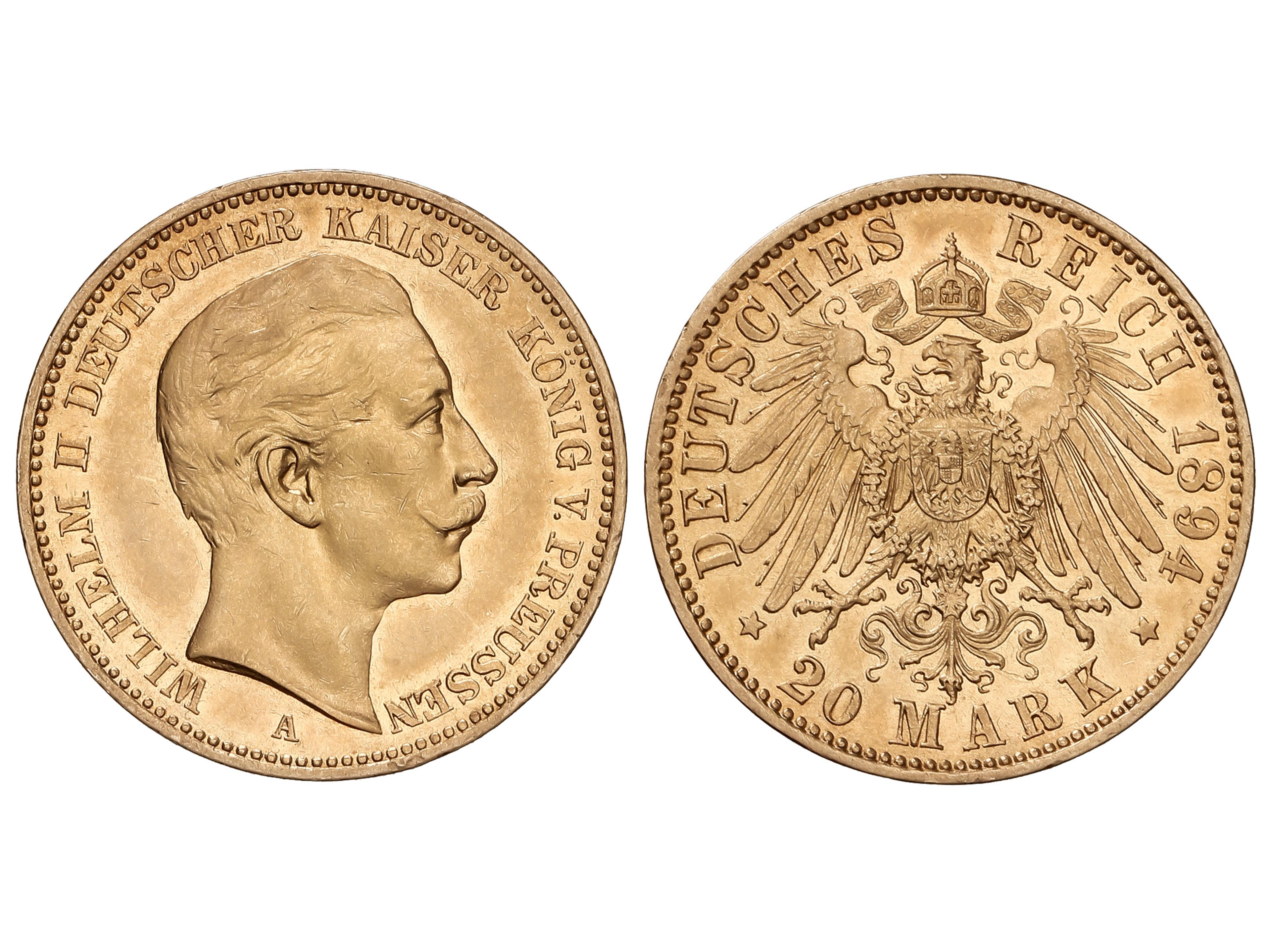 20 Mark. 1894-A. WILHELM II. PRUSSIA. 7,95 grs. AU (900). (Leves golpecitos). Restos de brillo original. Fr-3831; KM-521. EBC-/EBC. (Image1)