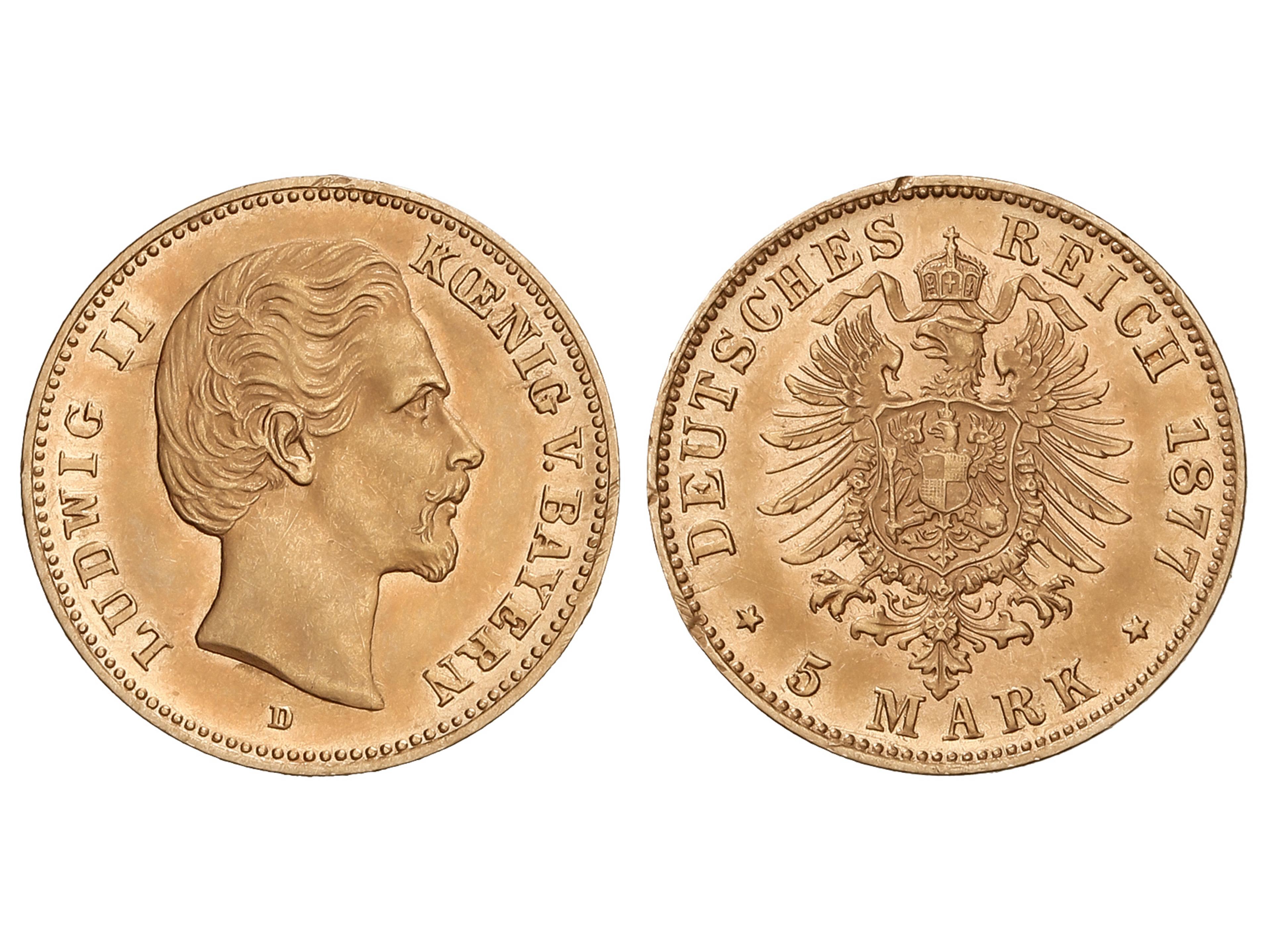 Mark. 1877-D. LUDWIG II. BAVARIA. 1,98 grs. AU (900). (Leves golpecitos en canto). Fr-3767; KM-904. EBC-. (Image1)