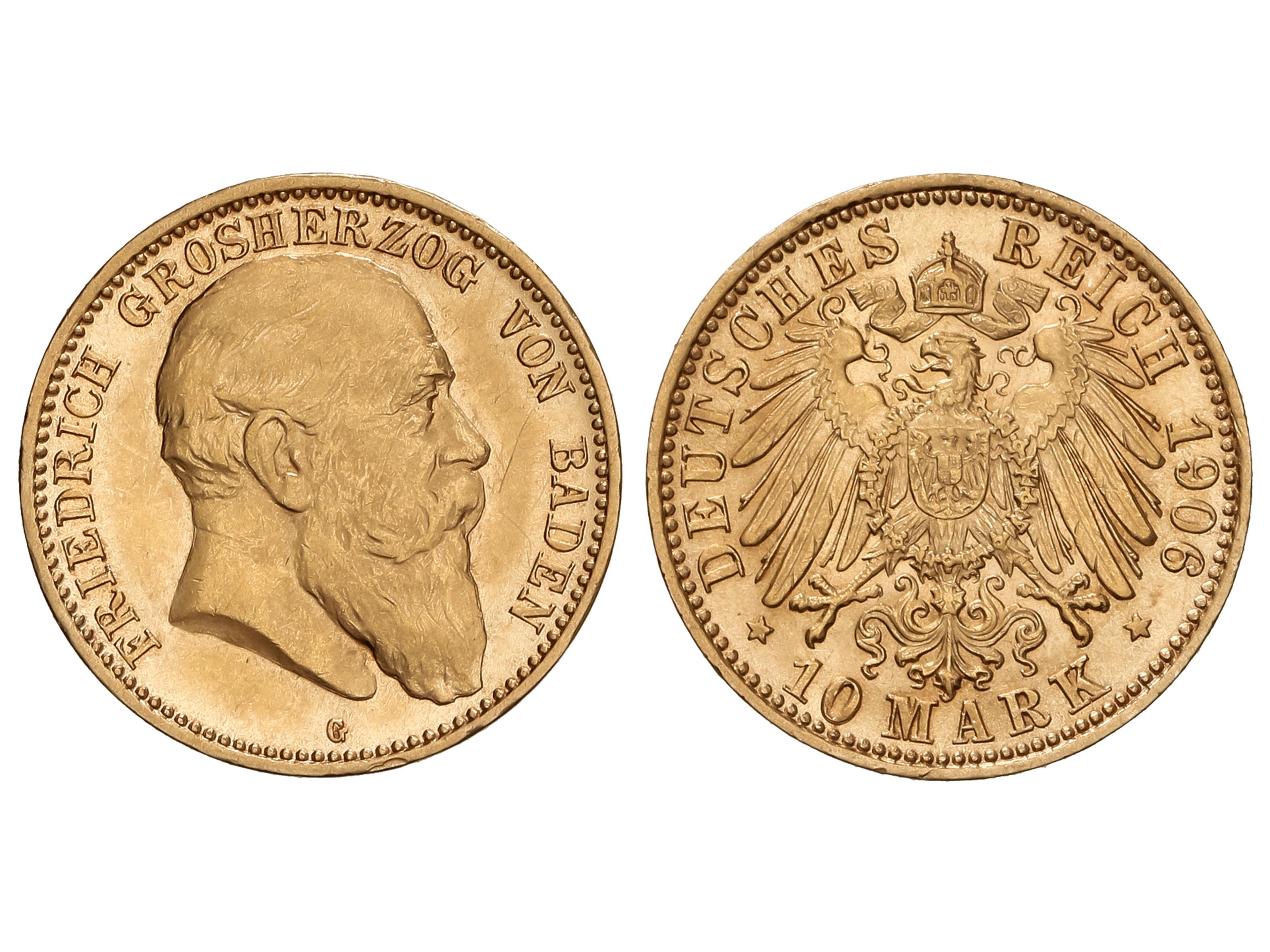 10 Mark. 1906-G. FRIEDRICH I. BADEN (Stuttgart). 3,98 grs. AU (900). (Leves rayitas en anverso). Fr-3758; KM-275. EBC-/EBC.