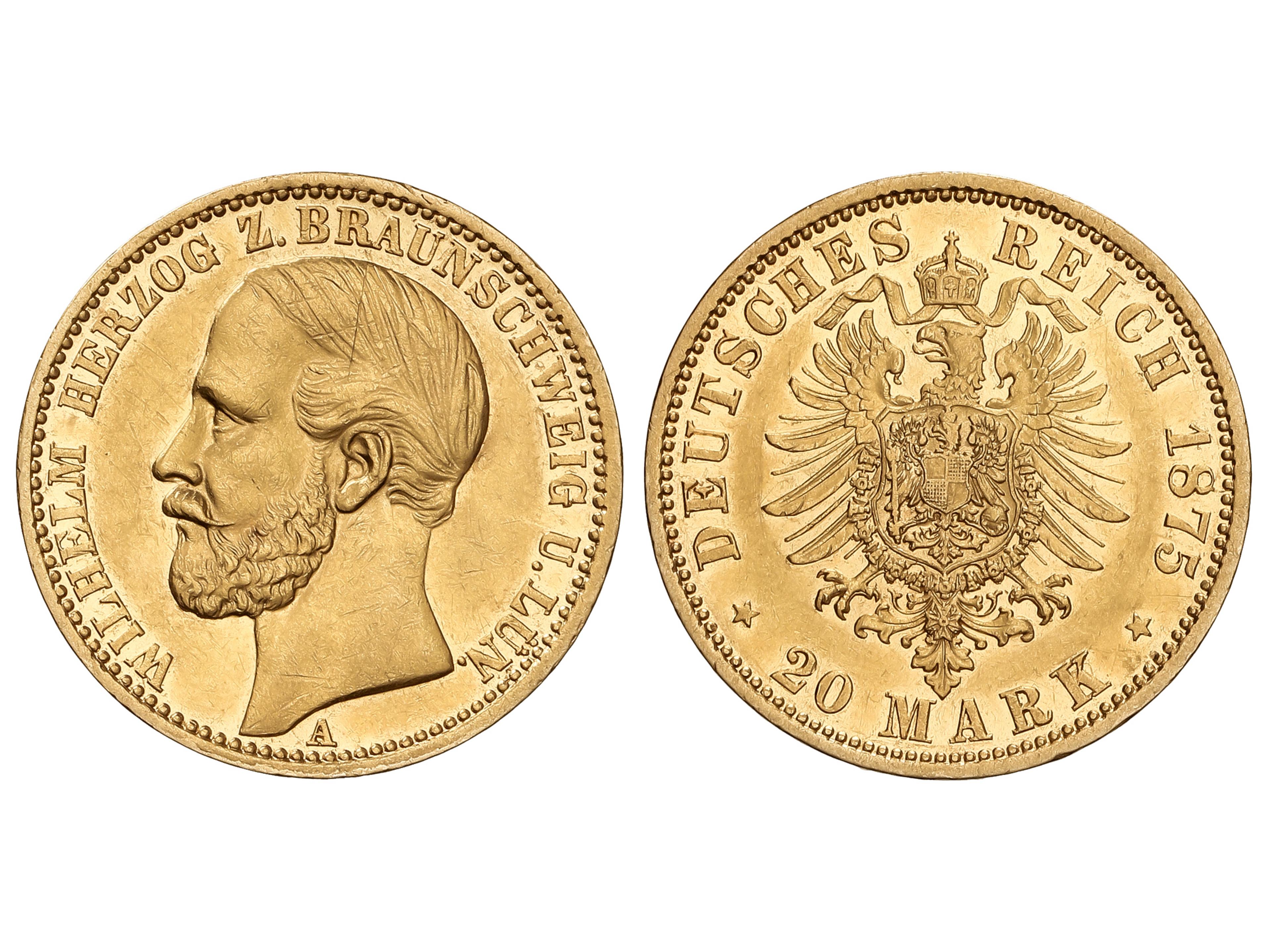 20 Mark. 1875-A. WILHELM. BRAUNSCHWEIG (Brunswick-Wolfenbuttel). 7,92 grs. AU (900). (Pequeñas rayitas). Restos de brillo original. Fr-3775; KM-1160. EBC. (Image1)
