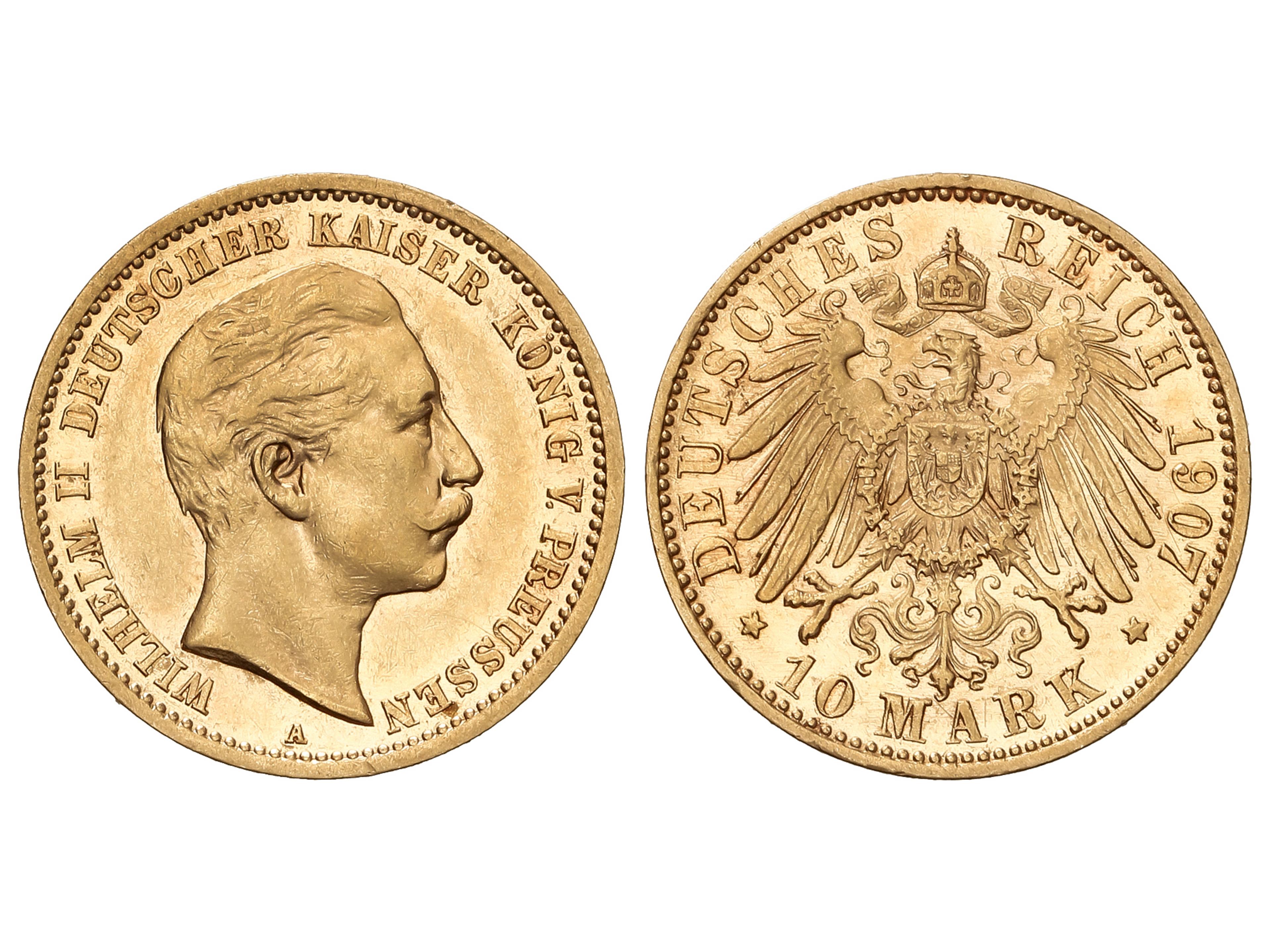 10 Mark. 1907-A. WILHELM II. PRUSSIA. 3,95 grs. AU (900). (Leves golpecitos). Brillo original. Fr-3835; KM-520. EBC.