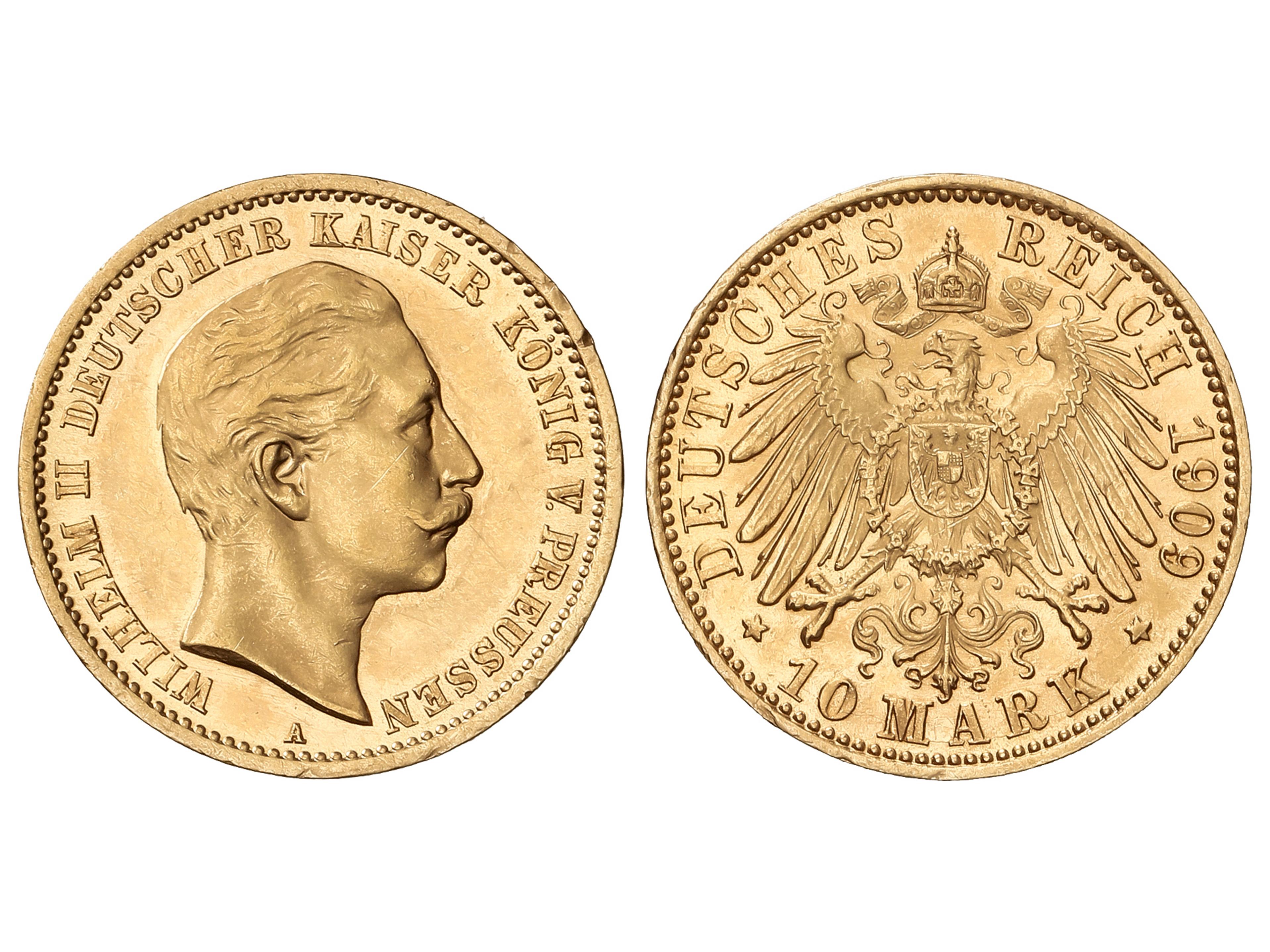 10 Mark. 1909-A. WILHELM II. PRUSSIA. 3,97 grs. AU (900). (Leve golpecito en gráfila). Brillo original. Fr-3835; KM-520. EBC-/EBC. (Image1)