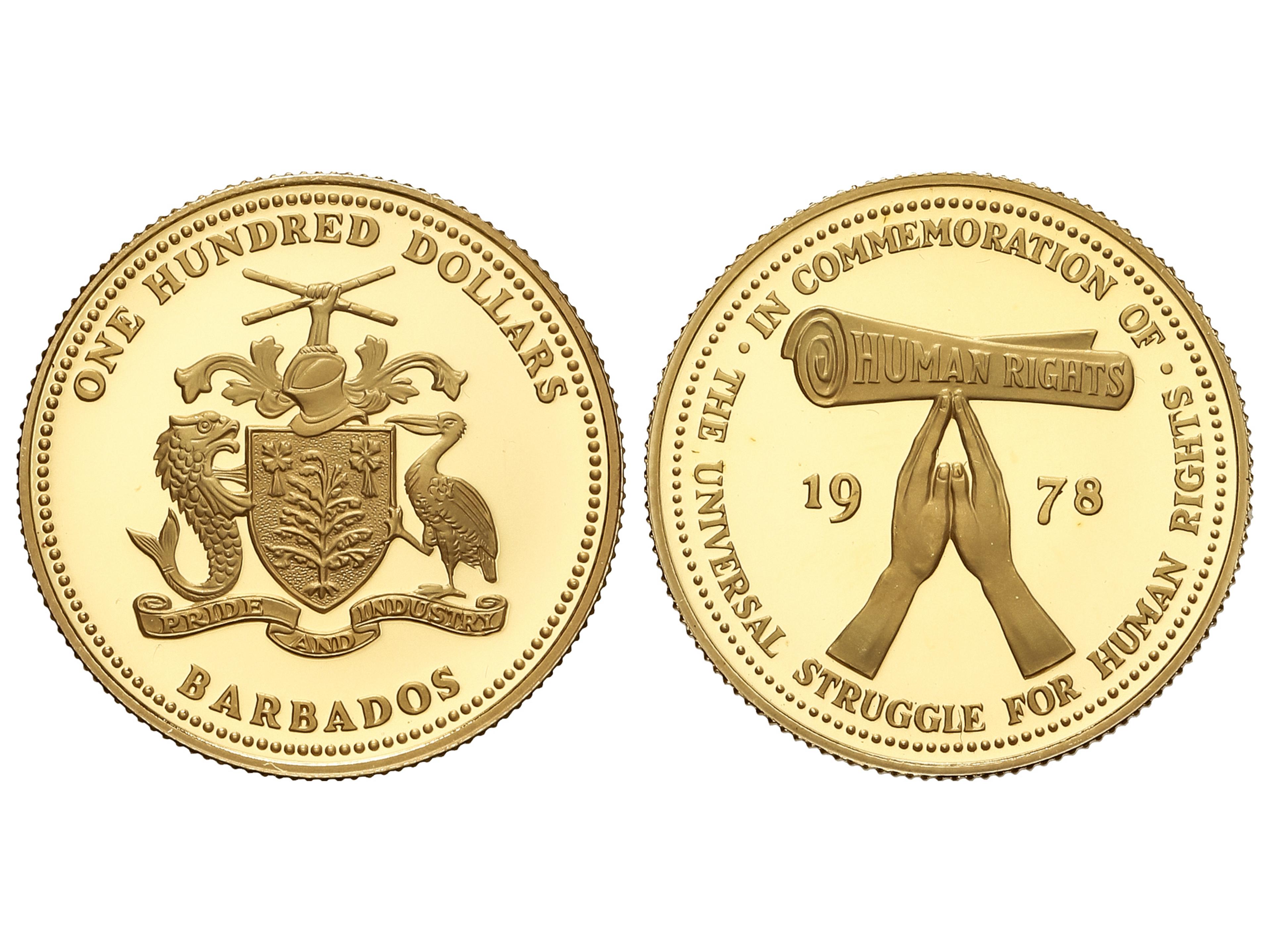 460 image100 Dollars. 1978. 5,01 grs. AU (900). Declaración de los derechos humanos: manos rezando y documento. RARA. Fr-3; KM-28a. Tirada: 1.114 piezas. PROOF. (Image1)