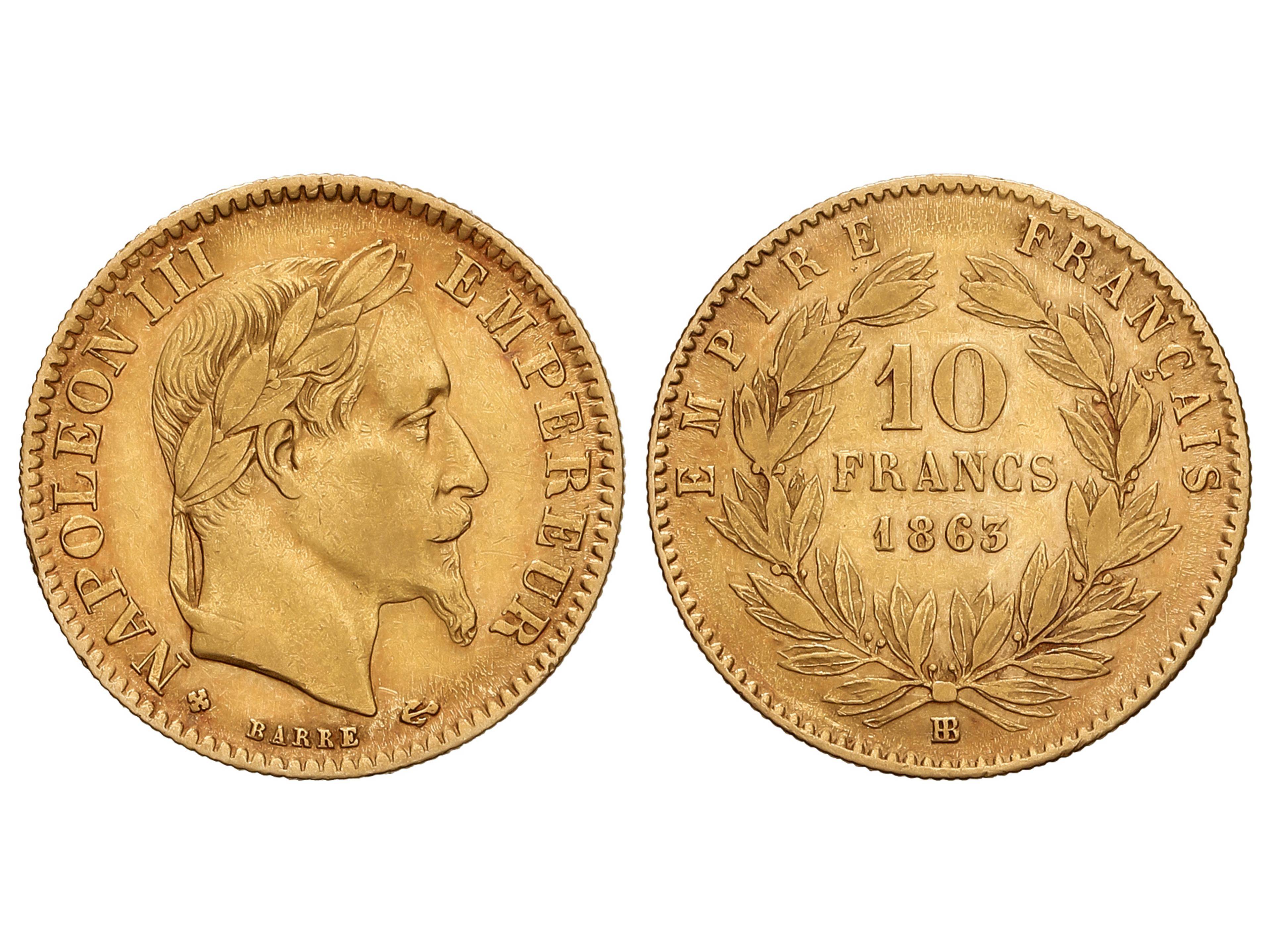 10 Francs. 1863-BB. NAPOLEON III. STRASBOURG. 3,19 grs. AU (900). BB pequeña. (Leves rayitas). Fr-587; KM-800.2. MBC.
