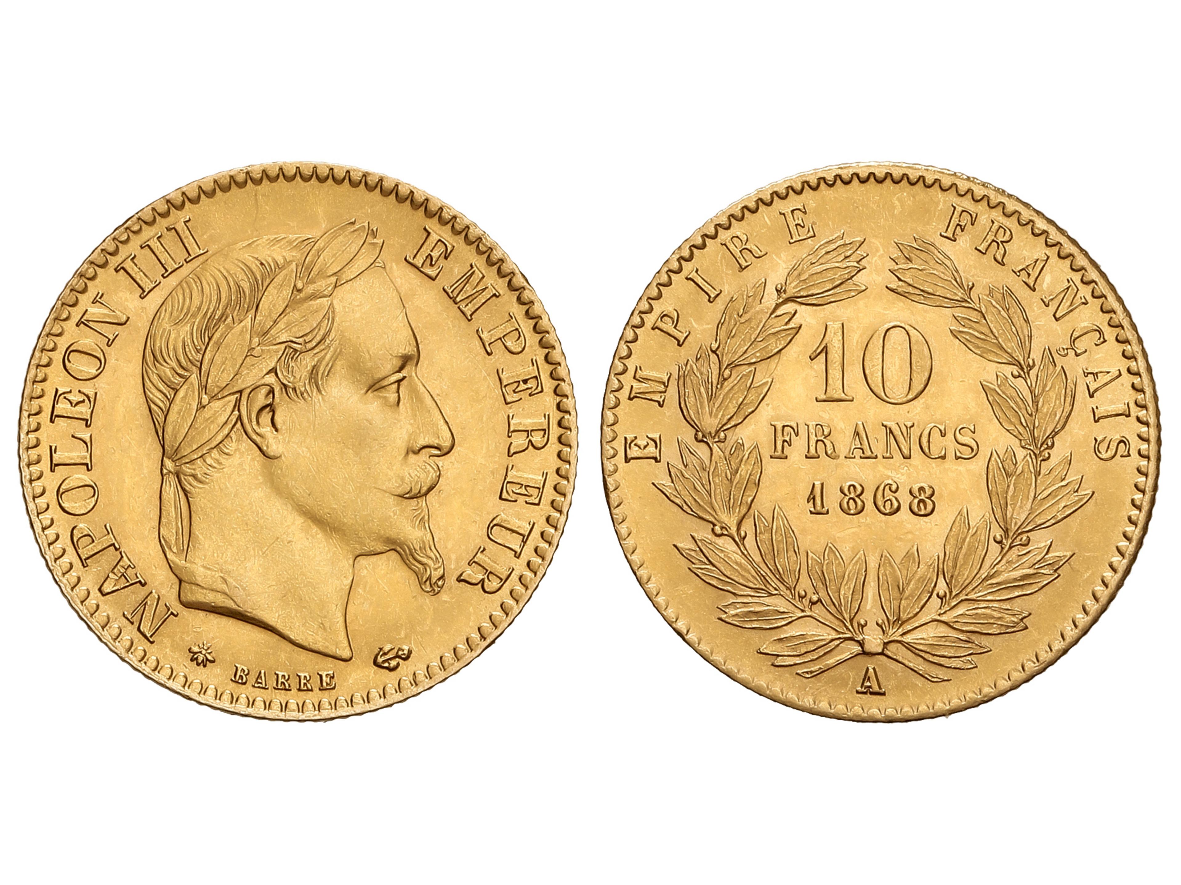 10 Francs. 1868-A. NAPOLEON III. PARIS. 3,22 grs. AU (900). (Pequeñas rayitas). Fr-586; KM-800.1. MBC+. (Image1)