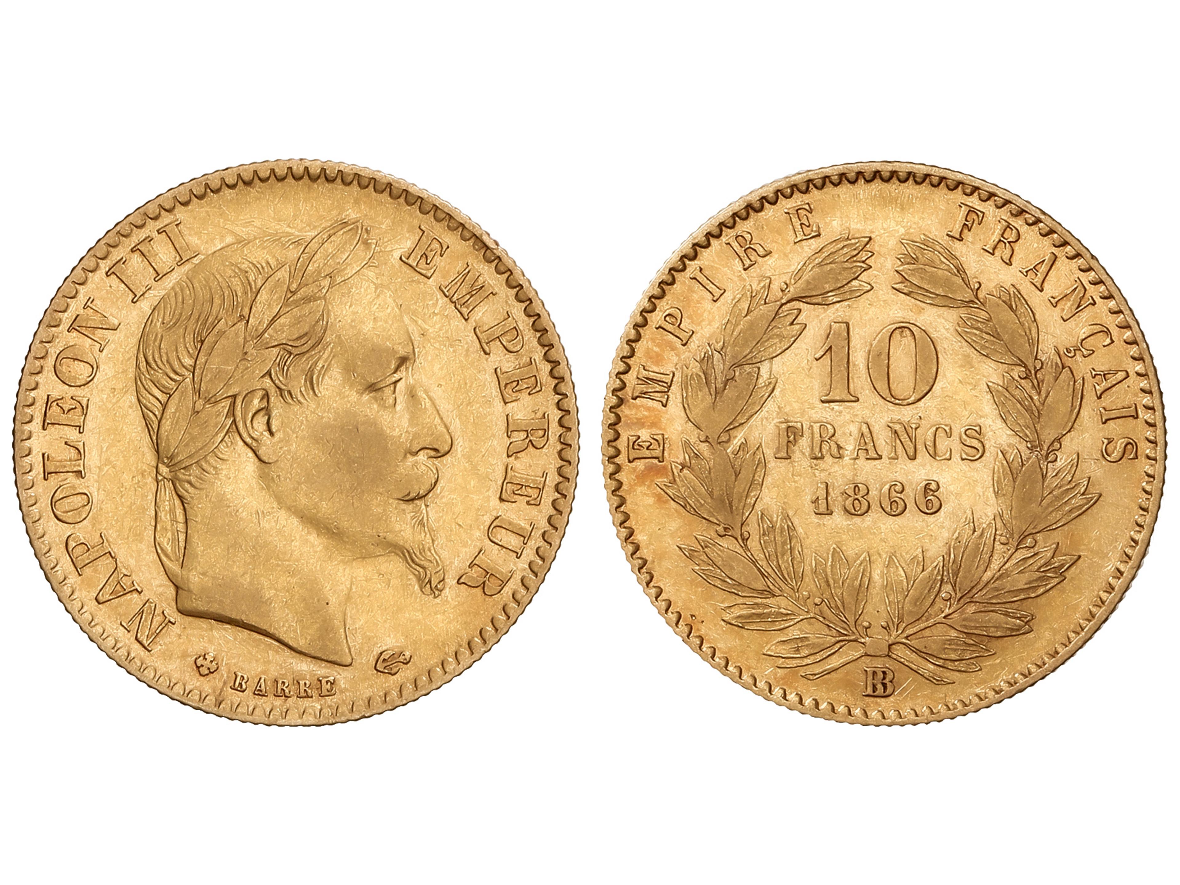 10 Francs. 1866-BB. NAPOLEON III. STRASBOURG. 3,19 grs. AU (900). BB grande. (Leves rayitas). Fr-587; KM-800.2. MBC.