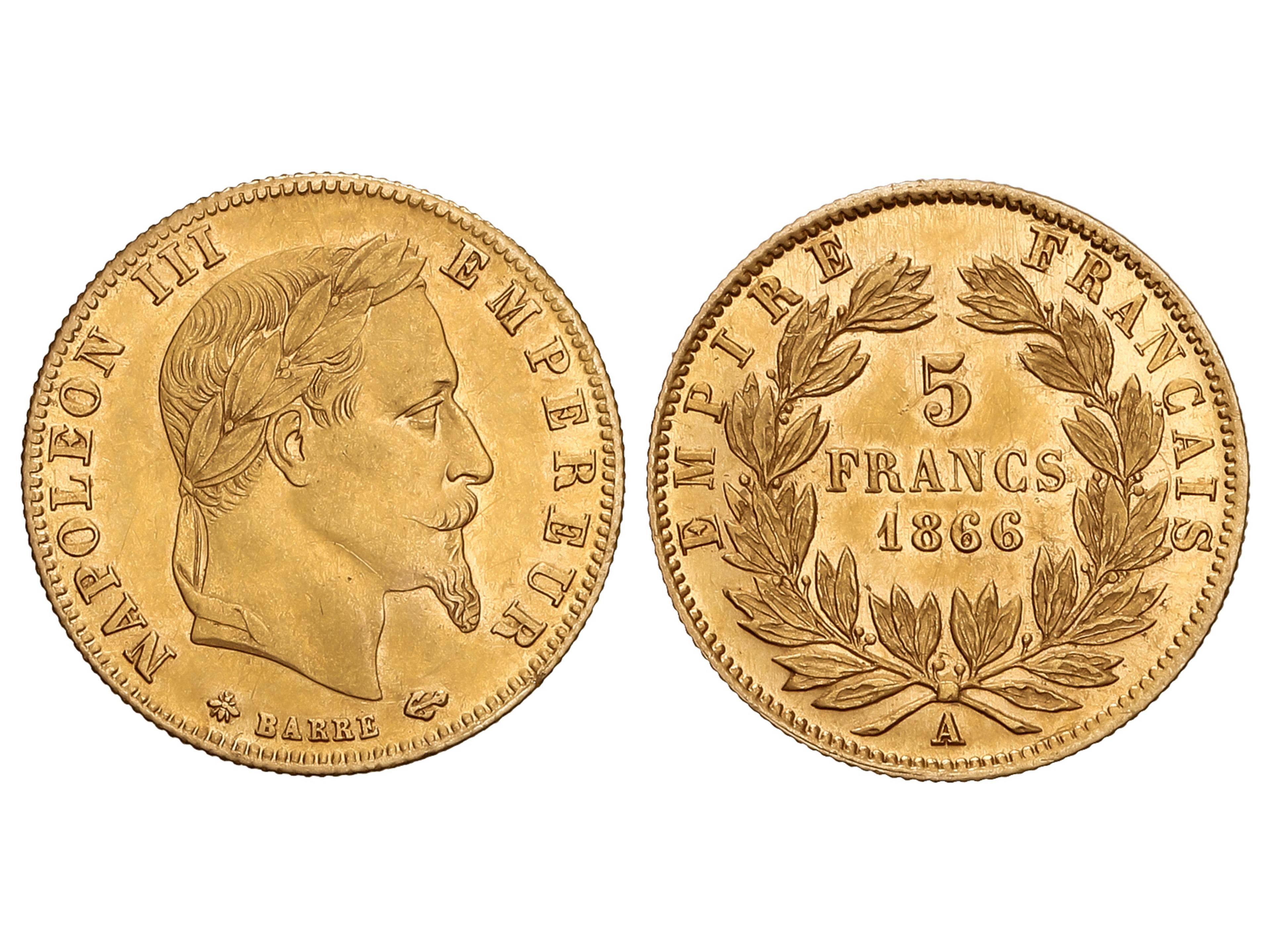 Francs. 1866-A. NAPOLEON III. PARIS. 1,61 grs. AU (900). Fr-588; KM-803.1. (EBC-)/EBC-. (Image1)