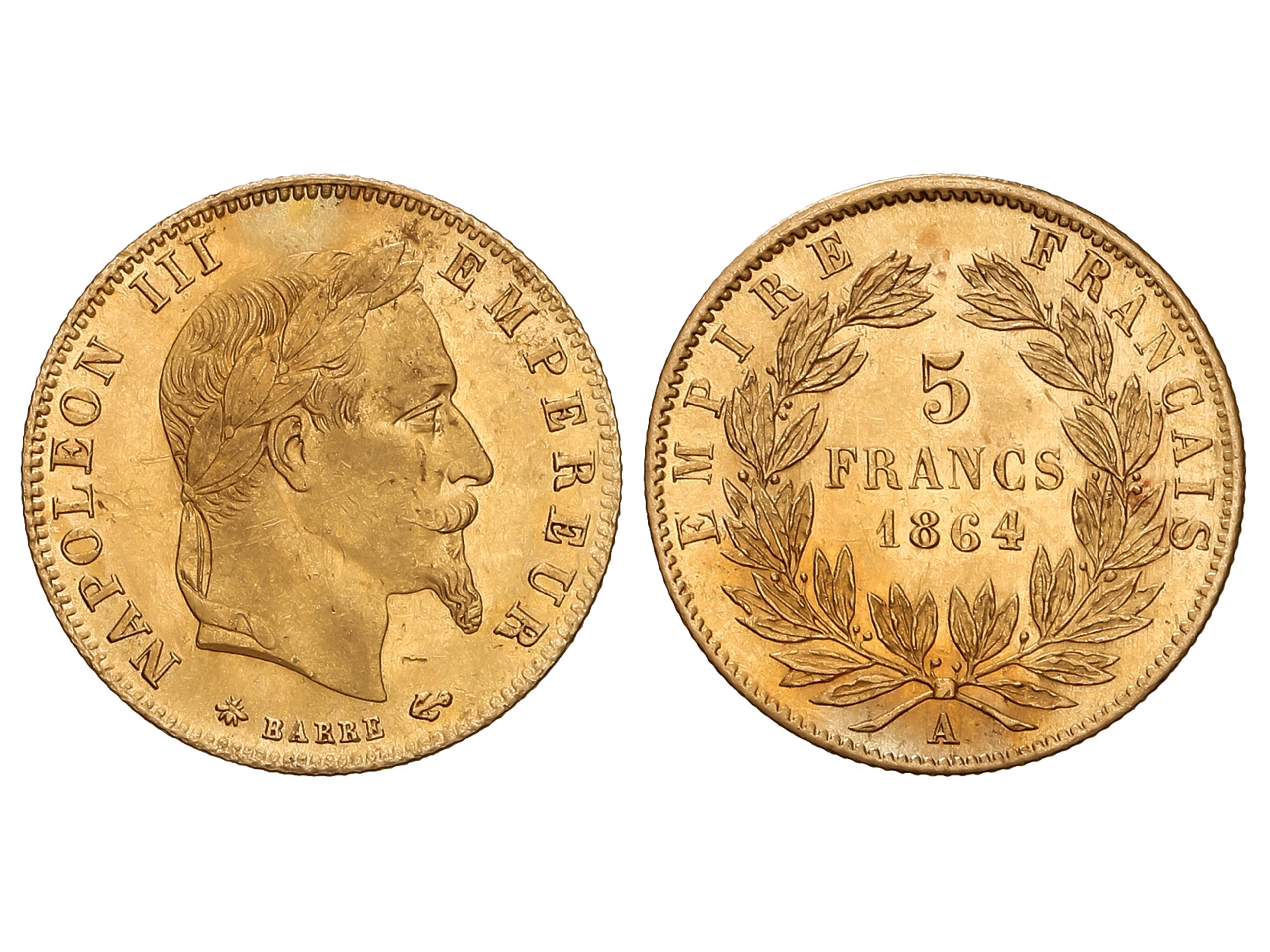 Francs. 1864-A. NAPOLEON III. PARIS. 1,60 grs. AU (900). Fr-588; KM-803.1. MBC+/EBC-. (Image1)