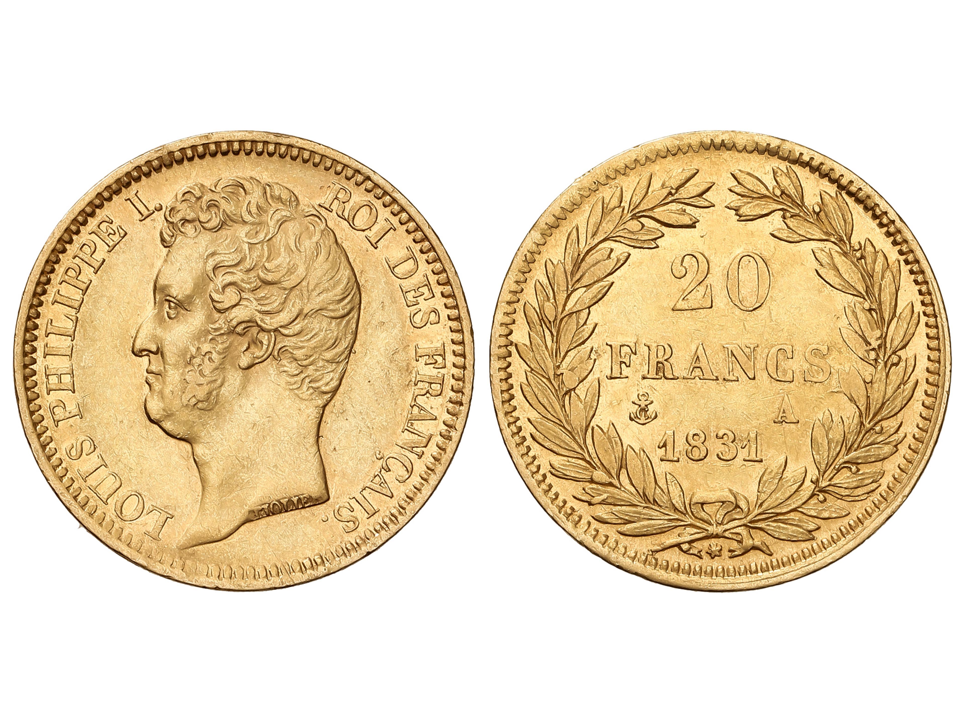 20 Francs. 1831-A. LOUIS PHILIPPE I. PARIS. 6,42 grs. AU (900). Leyenda incusa en el canto. Fr-553; KM-739.1. MBC+.