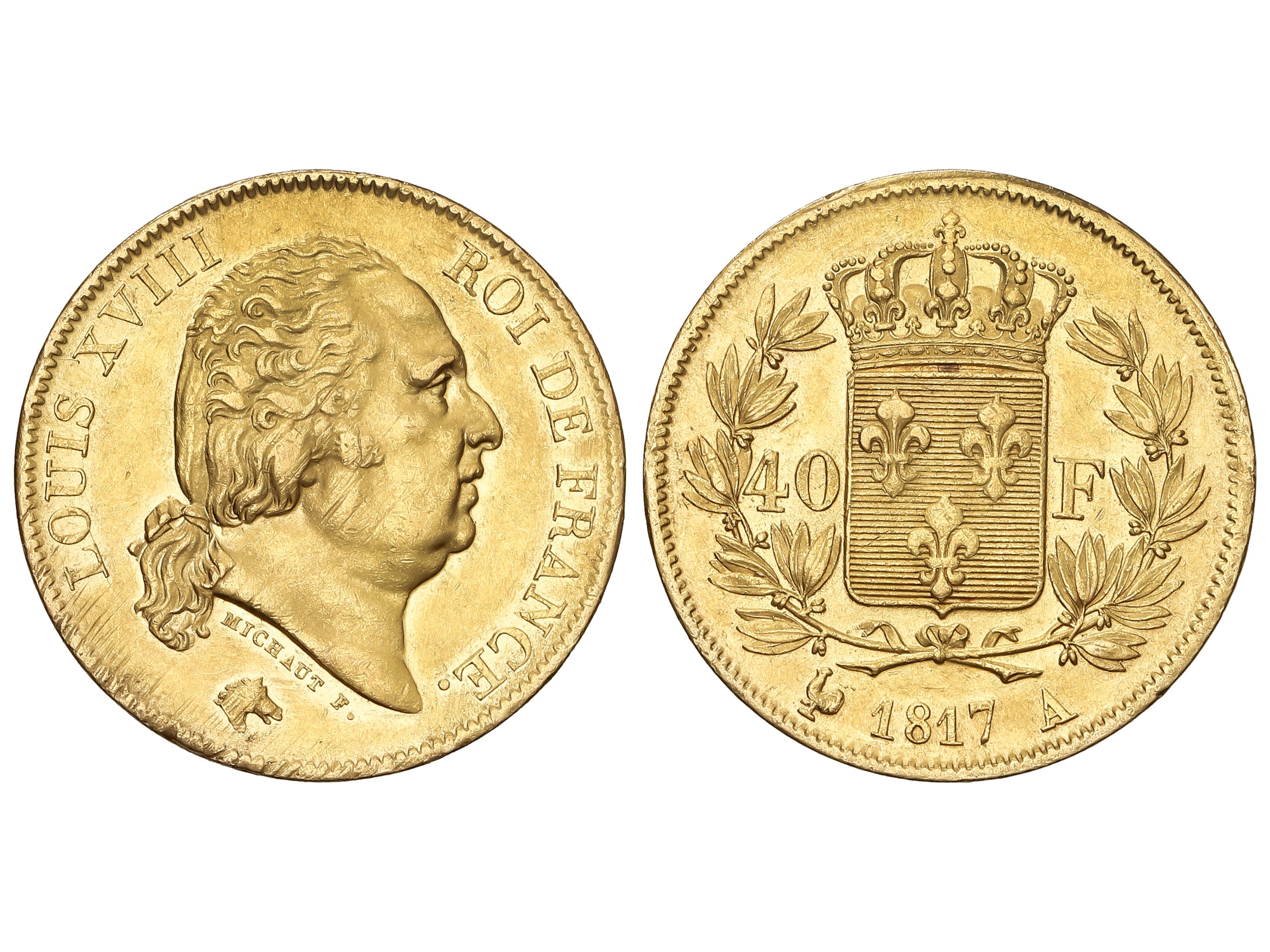40 Francs. 1817-A. LOUIS XVIII. PARIS. 12,83 grs. AU (900). (Leves rayitas de ajuste en anverso). Fr-532; KM-713.1. EBC-.