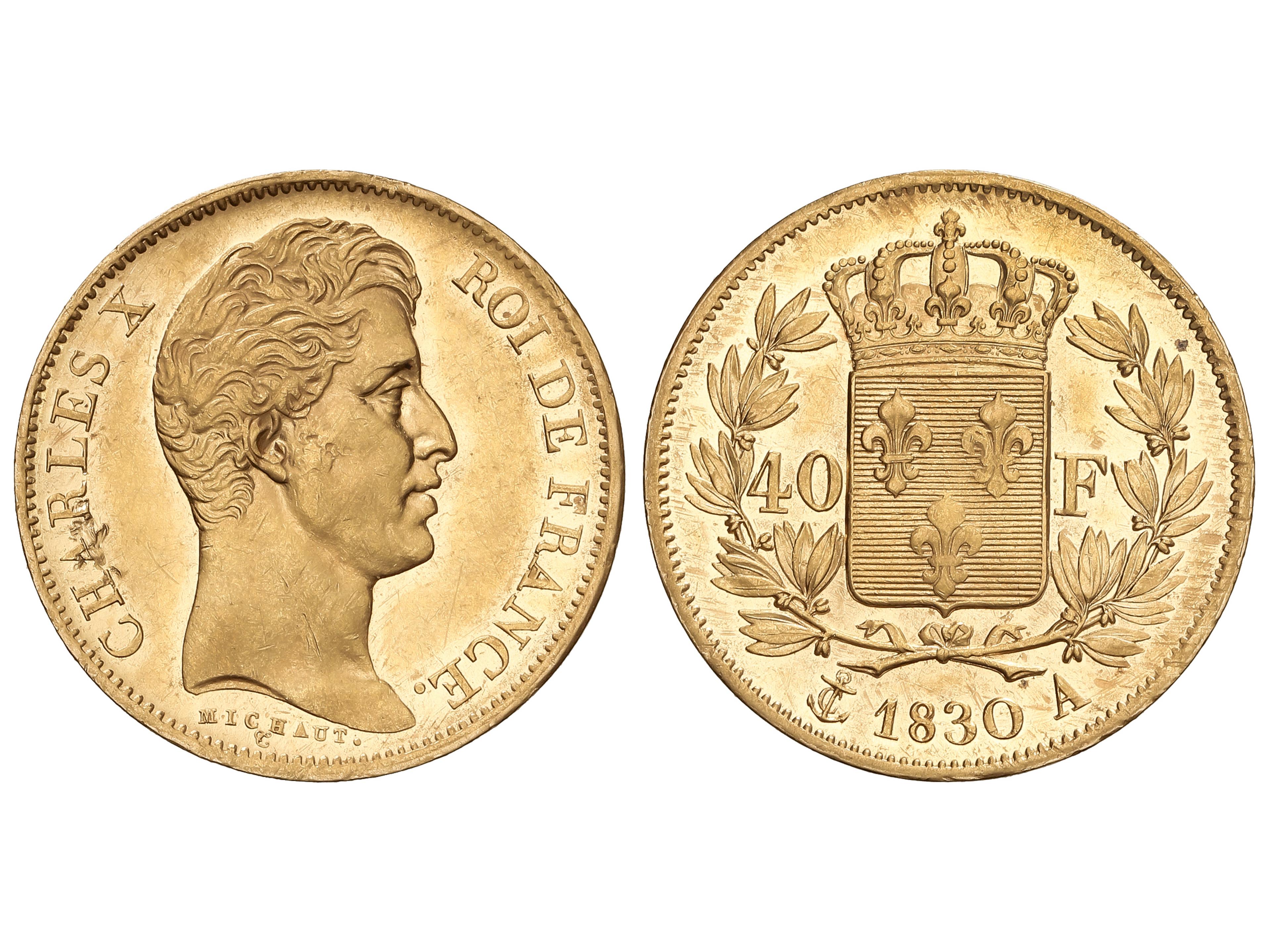 40 Francs. 1830-A. CHARLES X. PARIS. 12,87 grs. AU (900). Variante MICHAUT bajo el cuello en curva. (Pequeños golpecitos). Restos de brillo original. Fr-547; KM-721.1. EBC/EBC+. (Image1)