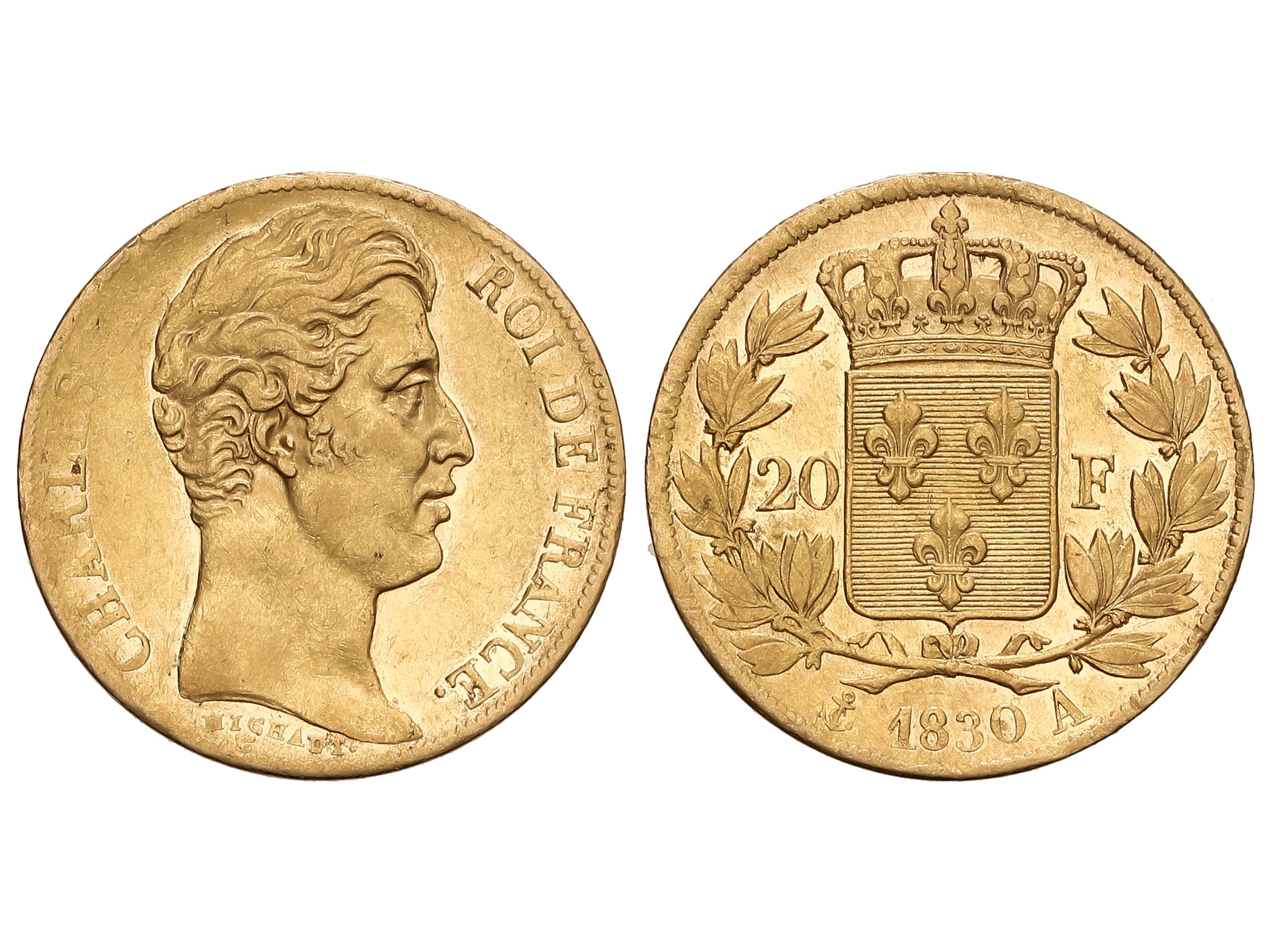20 Francs. 1830-A. CHARLES X. PARIS. 6,41 grs. AU (900). Restos de brillo original. Fr-549; KM-726.1. MBC+/EBC-.