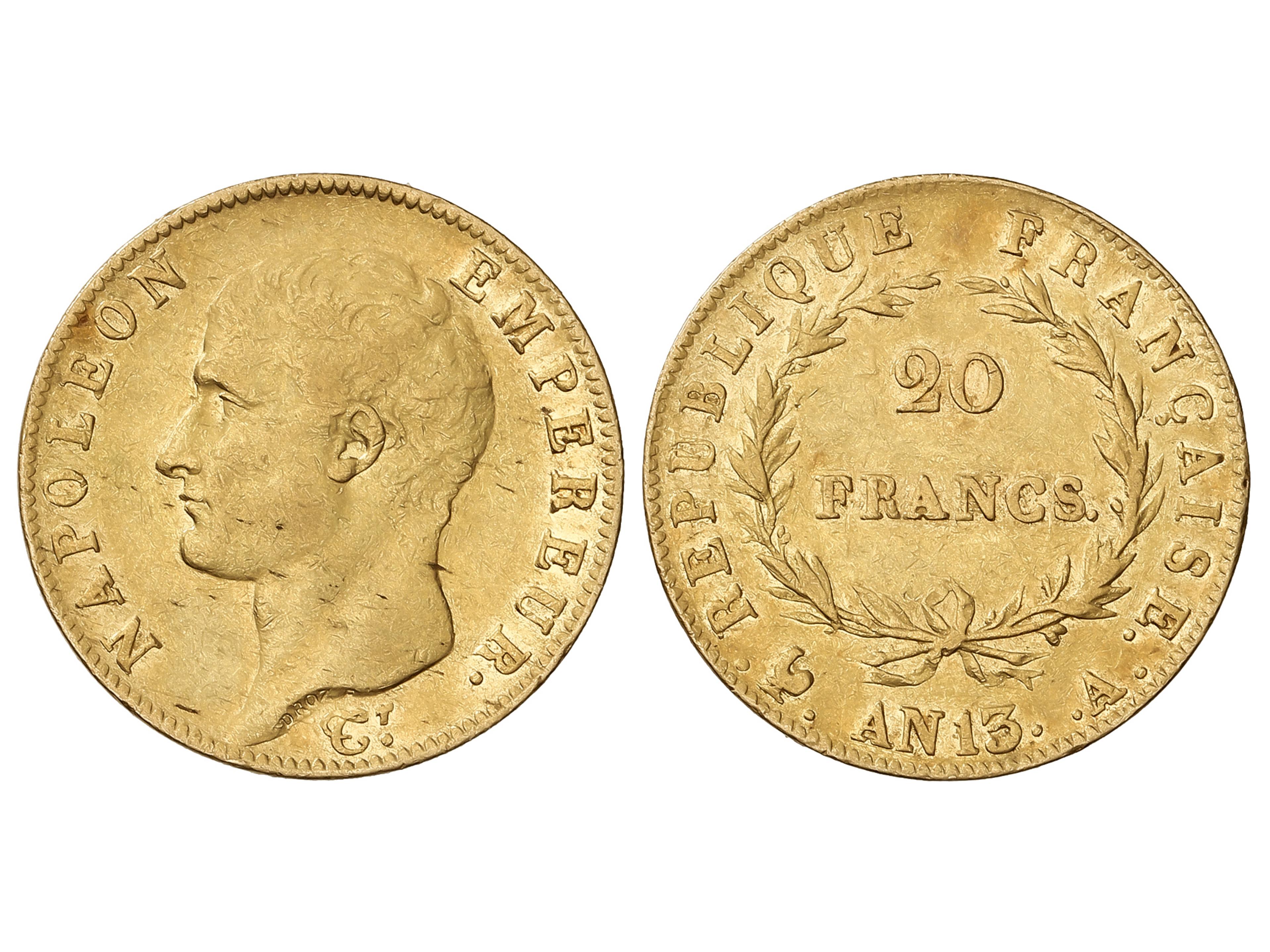 20 Francs. An 13-A (1804). NAPOLEON EMPEREUR. 6,38 grs. AU (900). (Golpecitos). Fr-482; KM-663.1. MBC-/MBC. (Image1)