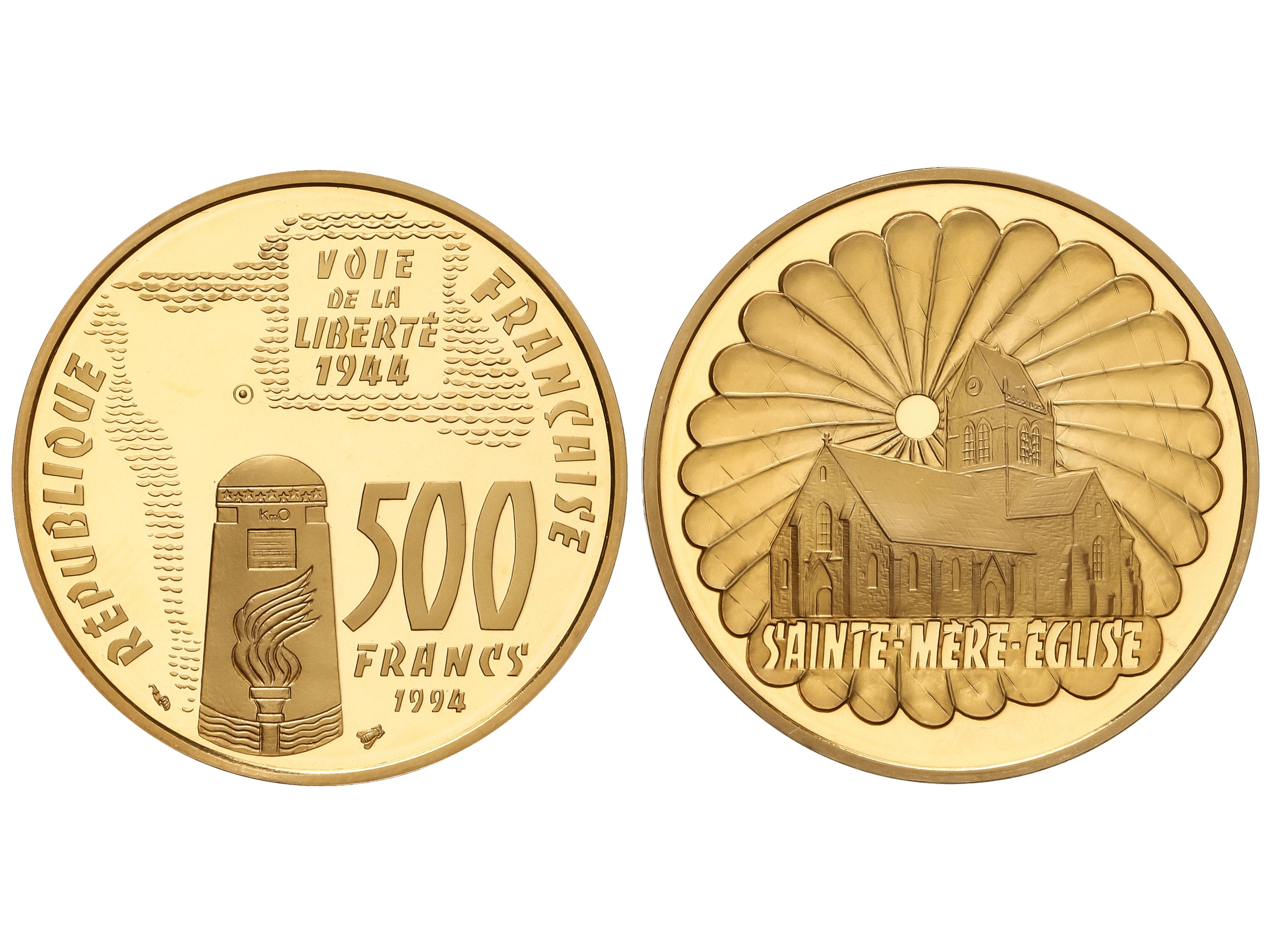 500 Francs. 1994. 17,00 grs. AU (920). 50 Aniversario de la liberación de París. Iglesia de Sainte-Mere-Eglise, paracaídas detrás. MUY RARA. Fr-653; KM-1055. Tirada: 443 piezas. PROOF. (Image1)