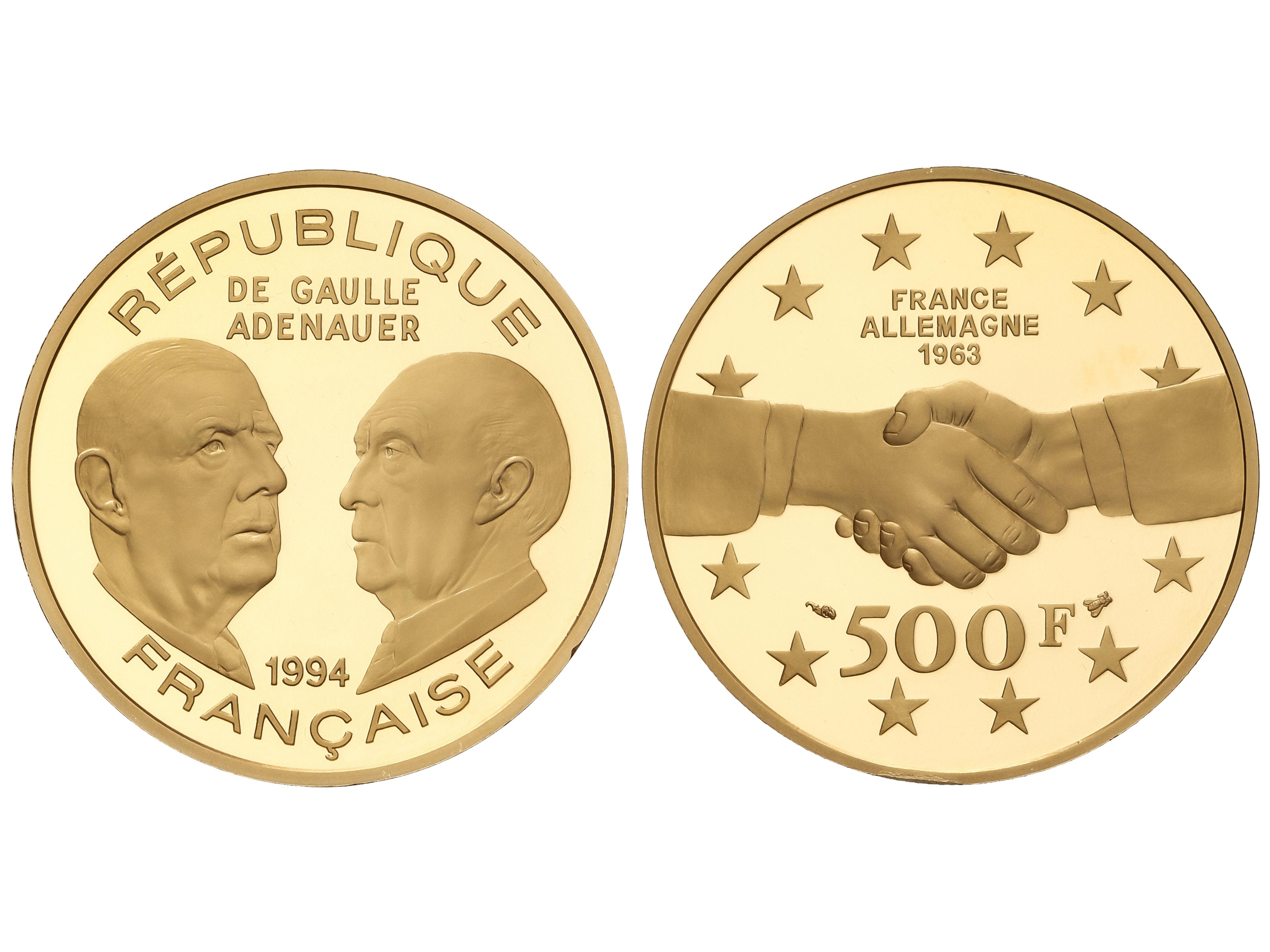 500 Francs. 1994. 16,99 grs. AU (920). 50 Aniversario de la liberación de París. Bustos de De Gaulle y Adenauer. MUY RARA. Fr-648; KM-1058. Tirada: 346 piezas. PROOF. (Image1)