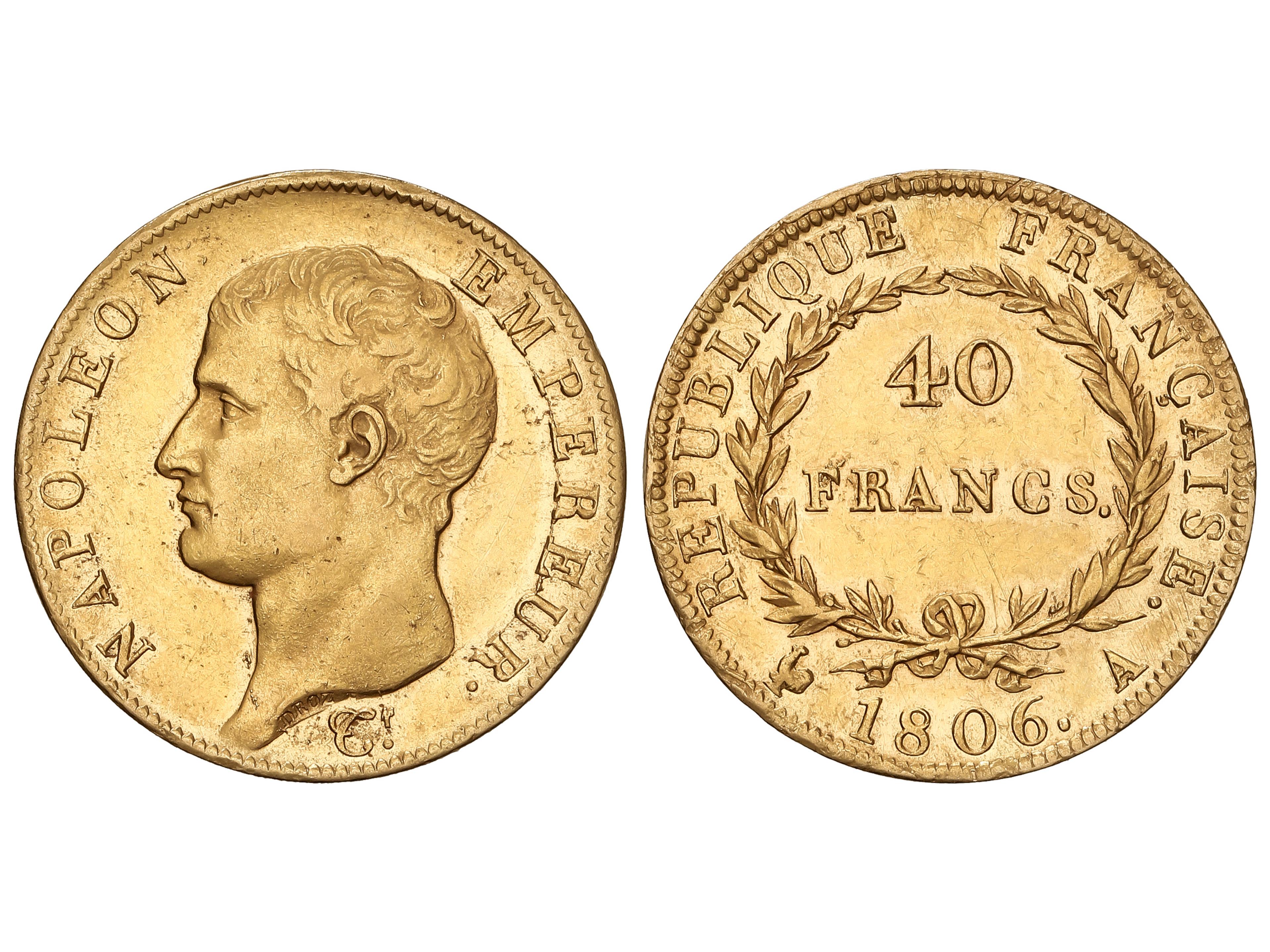 40 Francs. 1806-A. NAPOLEON EMPEREUR. PARIS. 12,86 grs. AU (900). (Leves rayitas). Restos de brillo original. Fr-481; KM-675.1. MBC+/EBC-. (Image1)