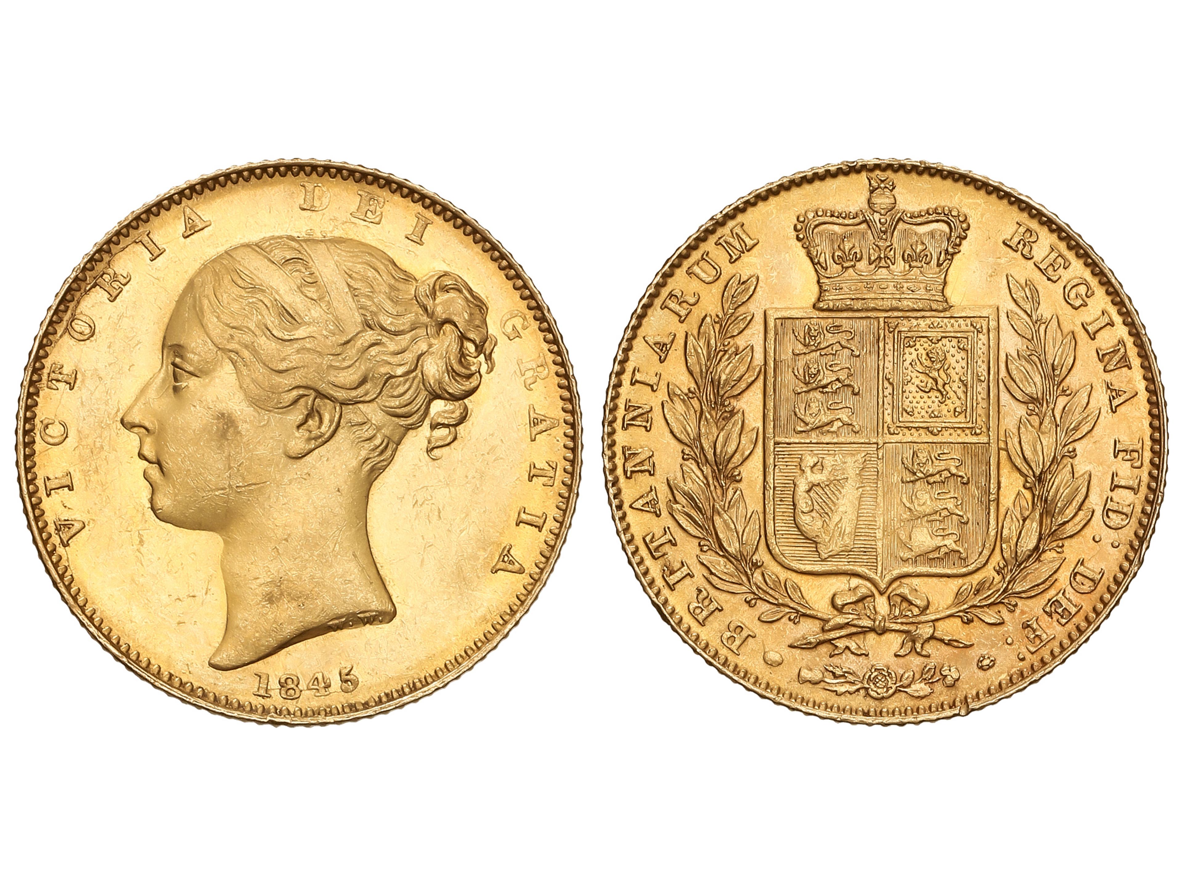 Sovereign. 1845. VICTORIA. 7,97 grs. AU (917). (Leves rayitas). Brillo original. Fr-387e; KM-736.1. EBC-. (Image1)