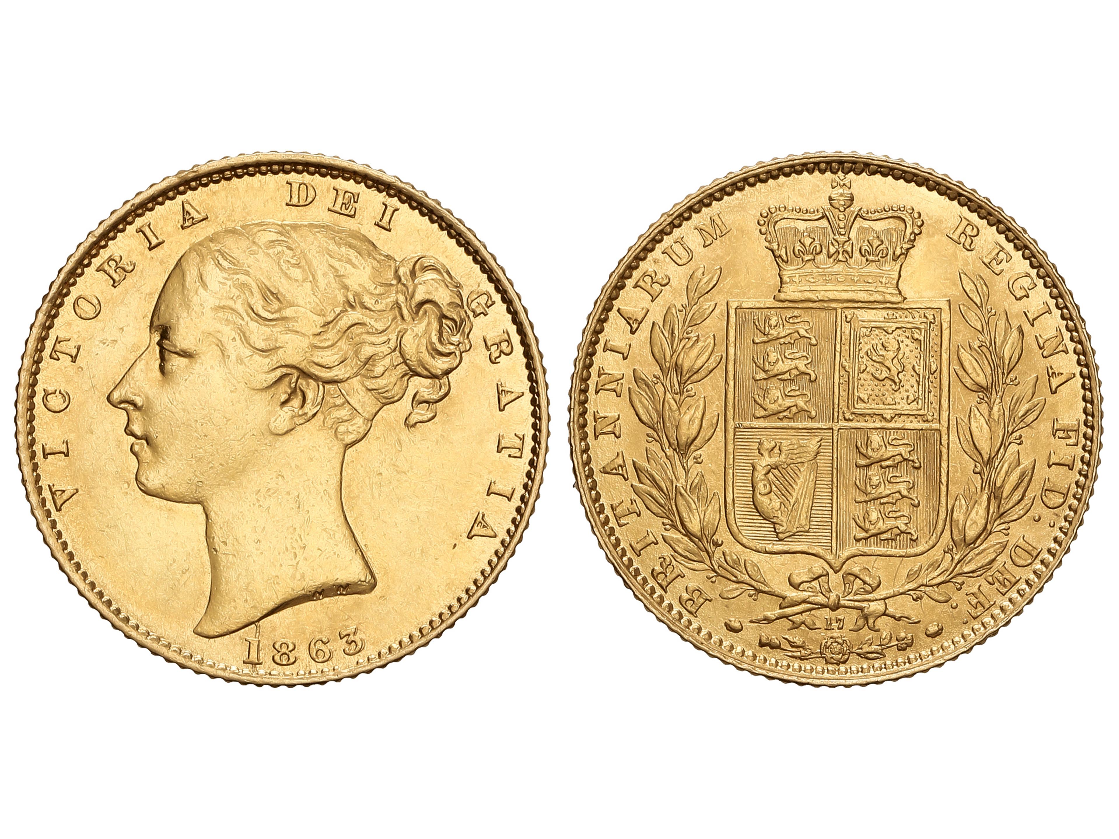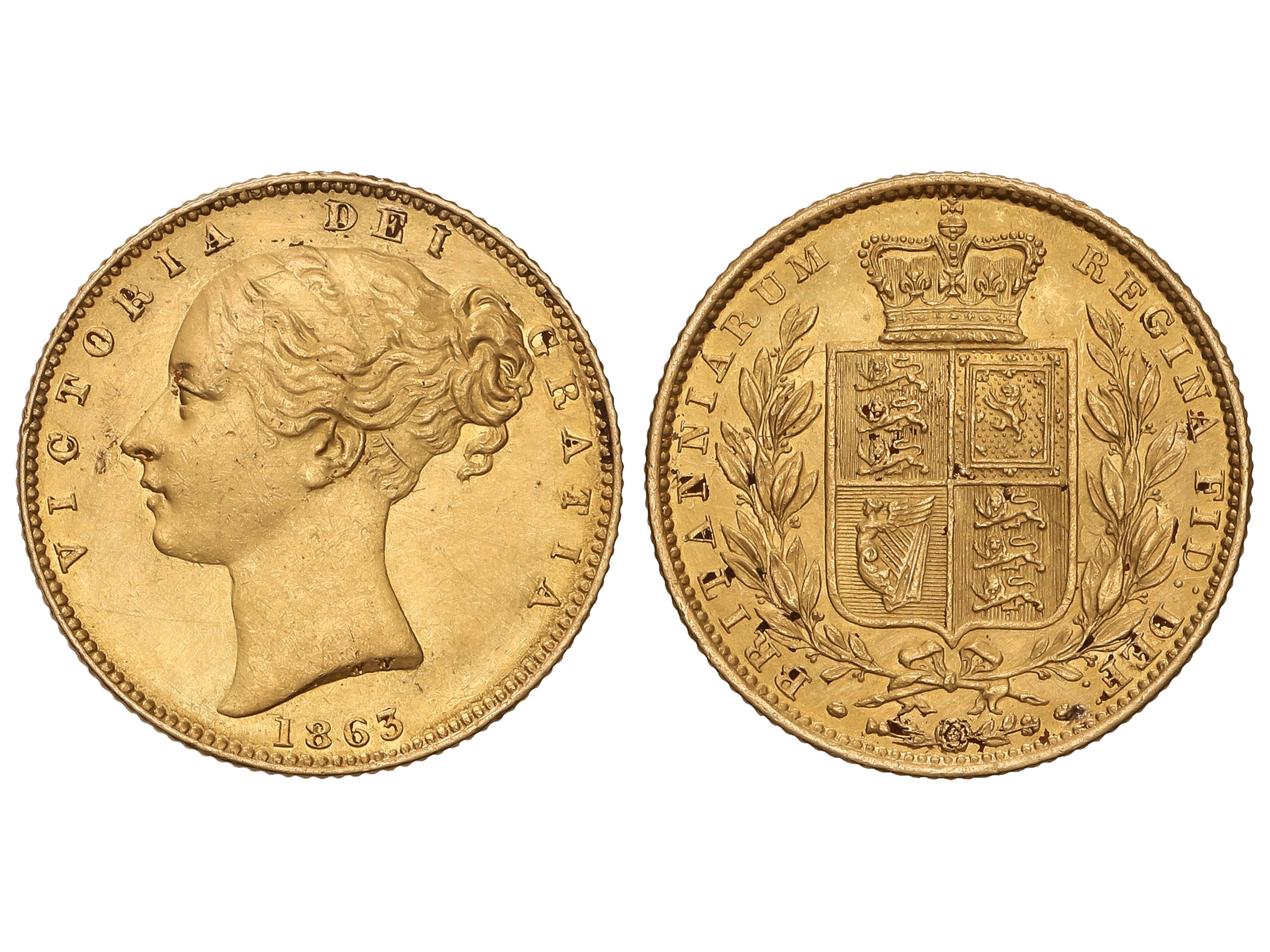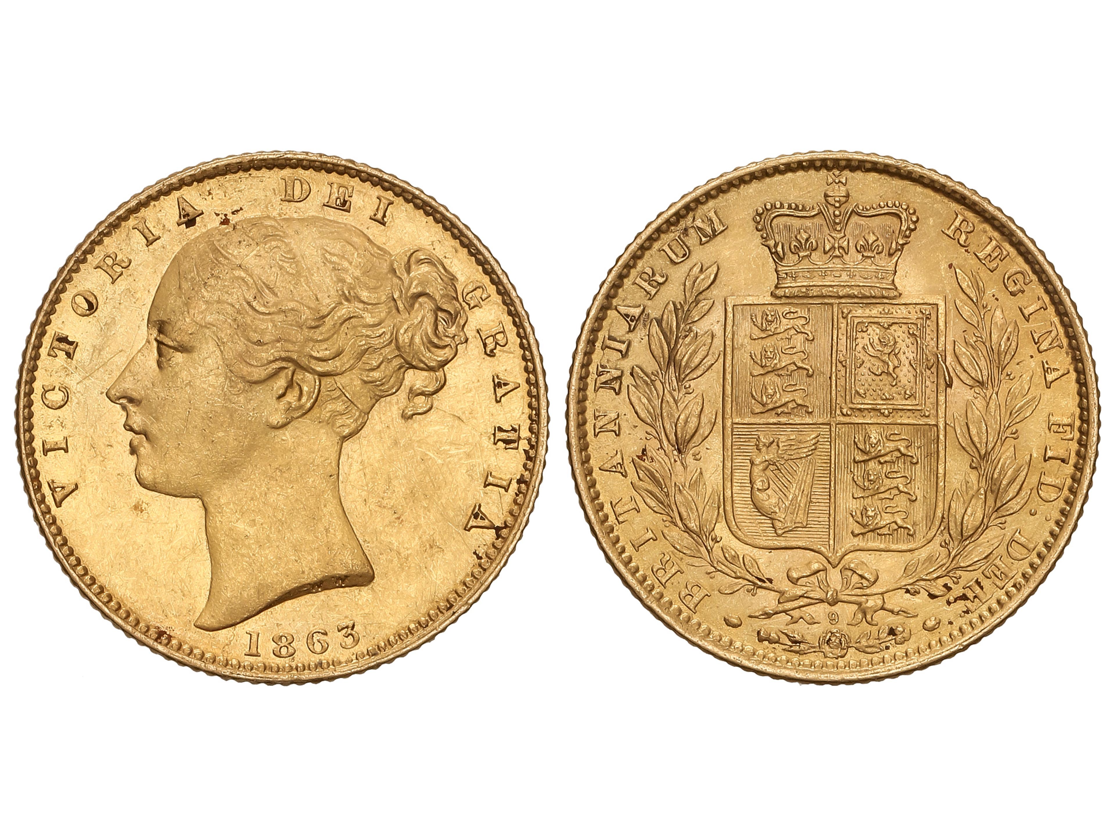 Sovereign. 1863. VICTORIA. 7,99 grs. AU (917). 17 bajo escudo del reverso. (Anverso levemente limpiado y con leves golpecitos). Fr-387i; KM-736.2. MBC+/EBC-. (Image1)