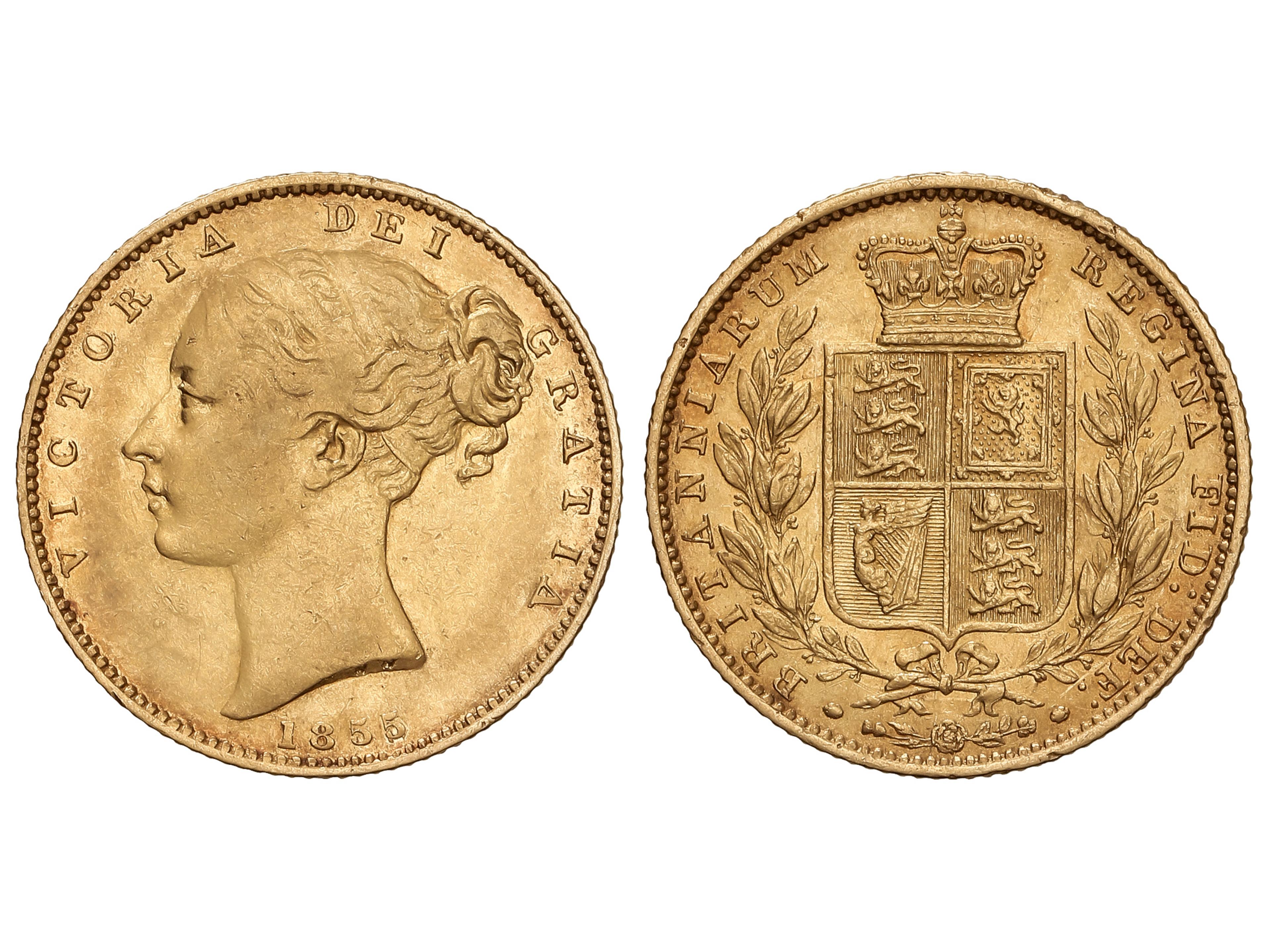 Sovereign. 1855. VICTORIA. 7,97 grs. AU (917). Tipo con WW incusa en cuello. (Leves golpecitos). Fr-387e; KM-736.1. MBC/MBC+.