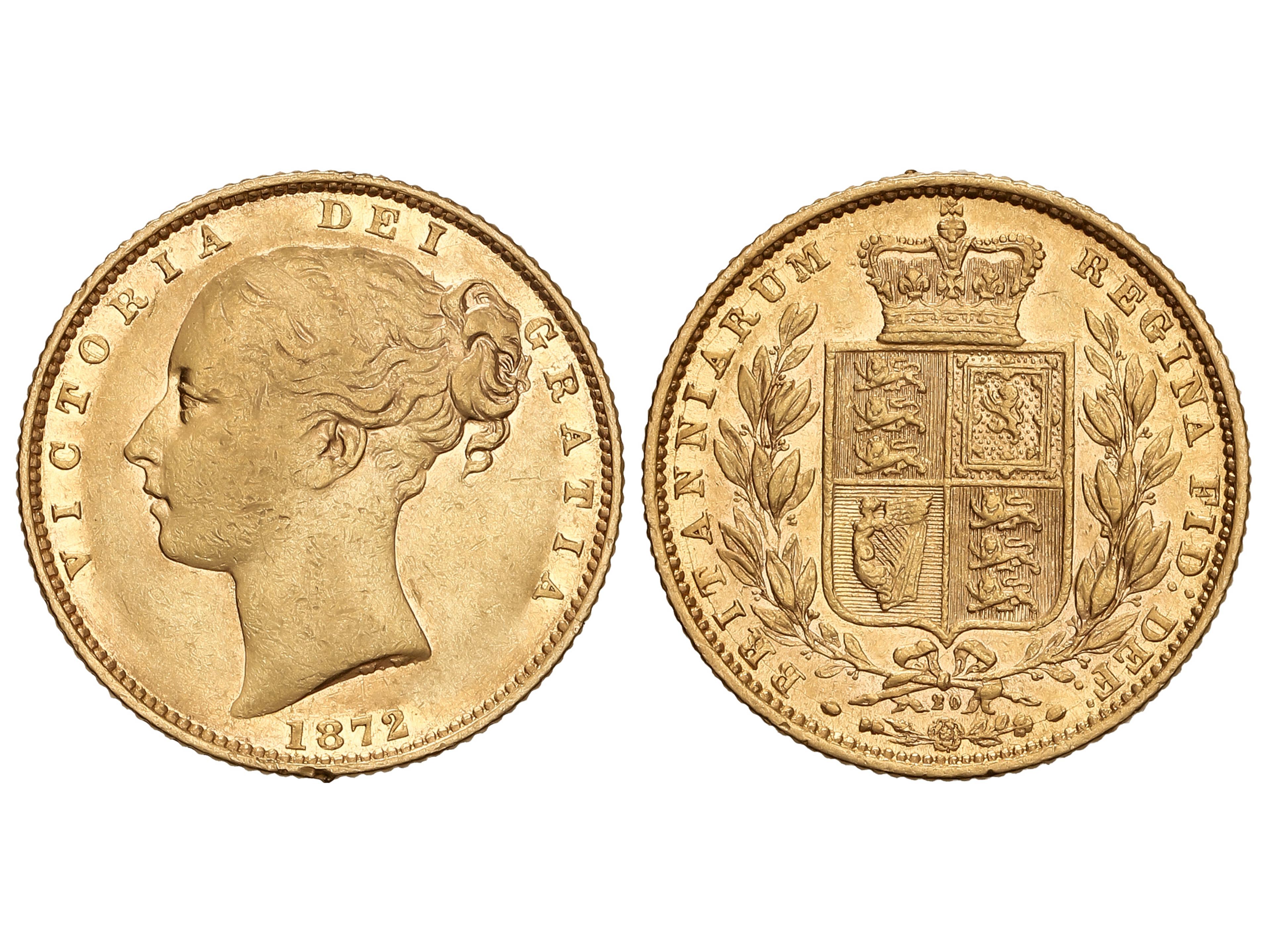 Sovereign. 1872. VICTORIA. 7,97 grs. AU (917). 20 bajo escudo del reverso. (Leves golpecitos). Leves restos de brillo original. Fr-387i; KM-736.2. MBC+. (Image1)