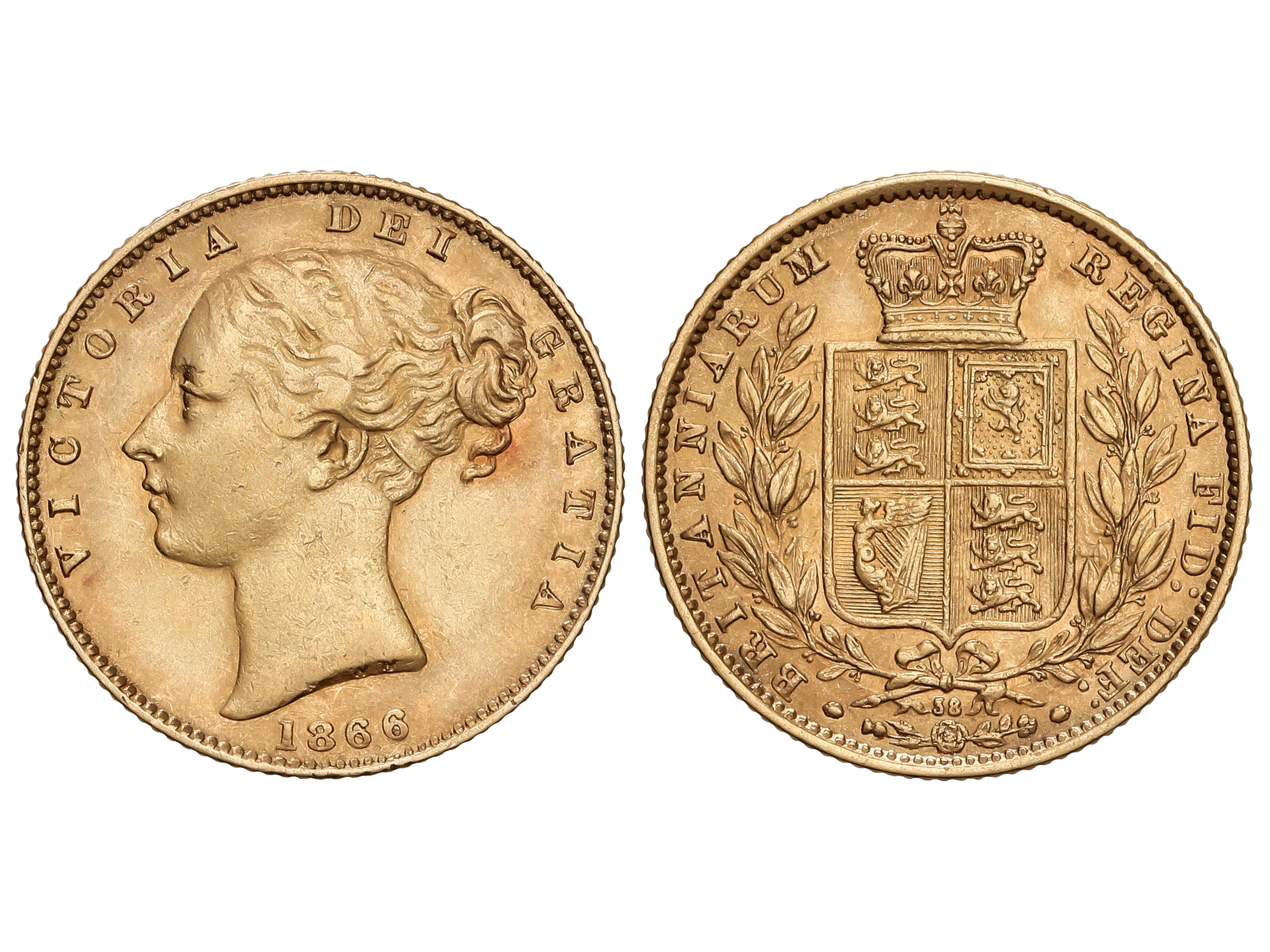 Sovereign. 1866. VICTORIA. 7,96 grs. AU (917). 38 bajo escudo del reverso. (Leves golpecitos). Fr-387i; KM-736.2. MBC+.