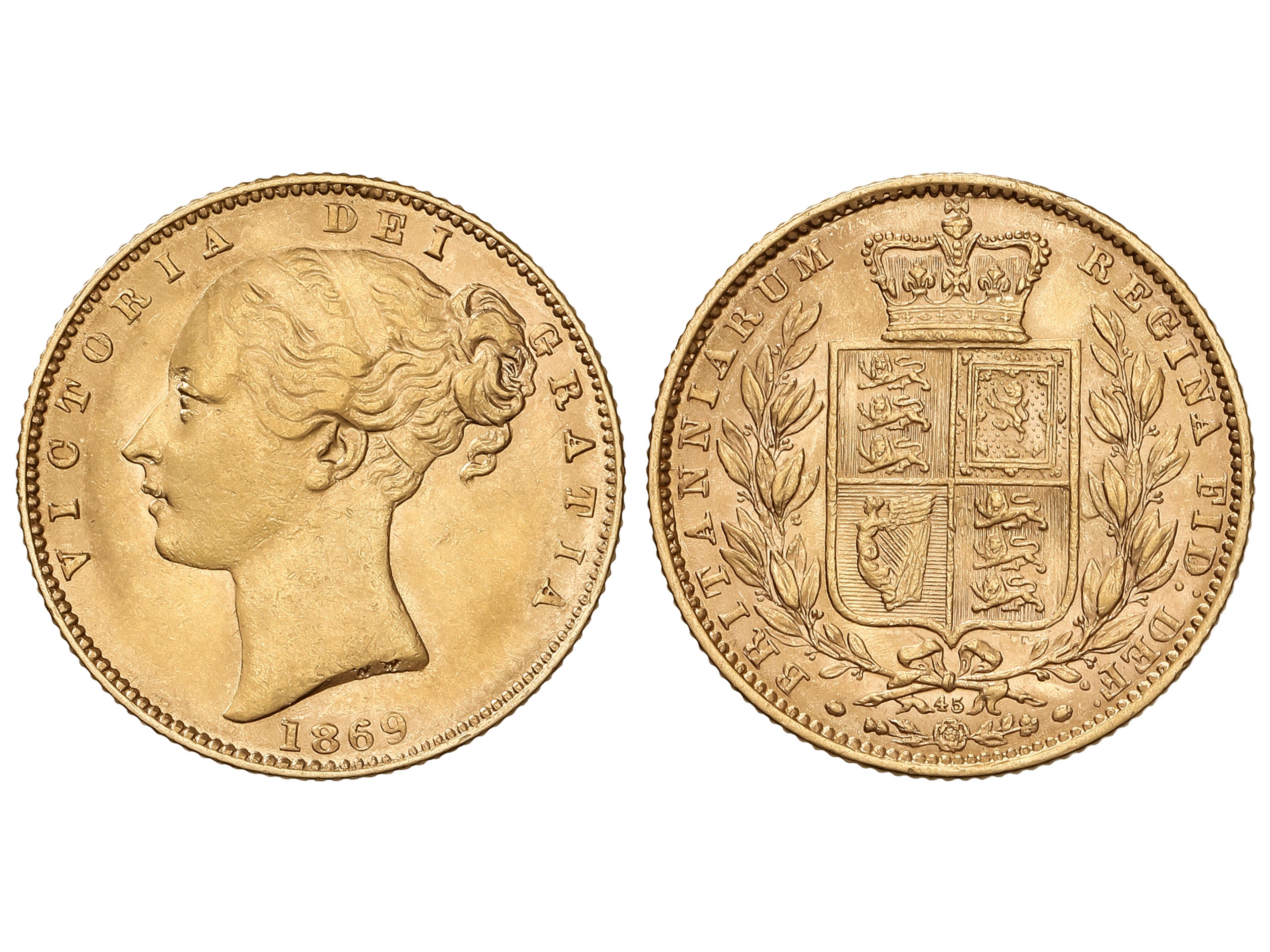 Sovereign. 1869. VICTORIA. 7,96 grs. AU (917). 45 bajo escudo del reverso. (Leves golpecitos). Fr-387i; KM-736.2. MBC+.