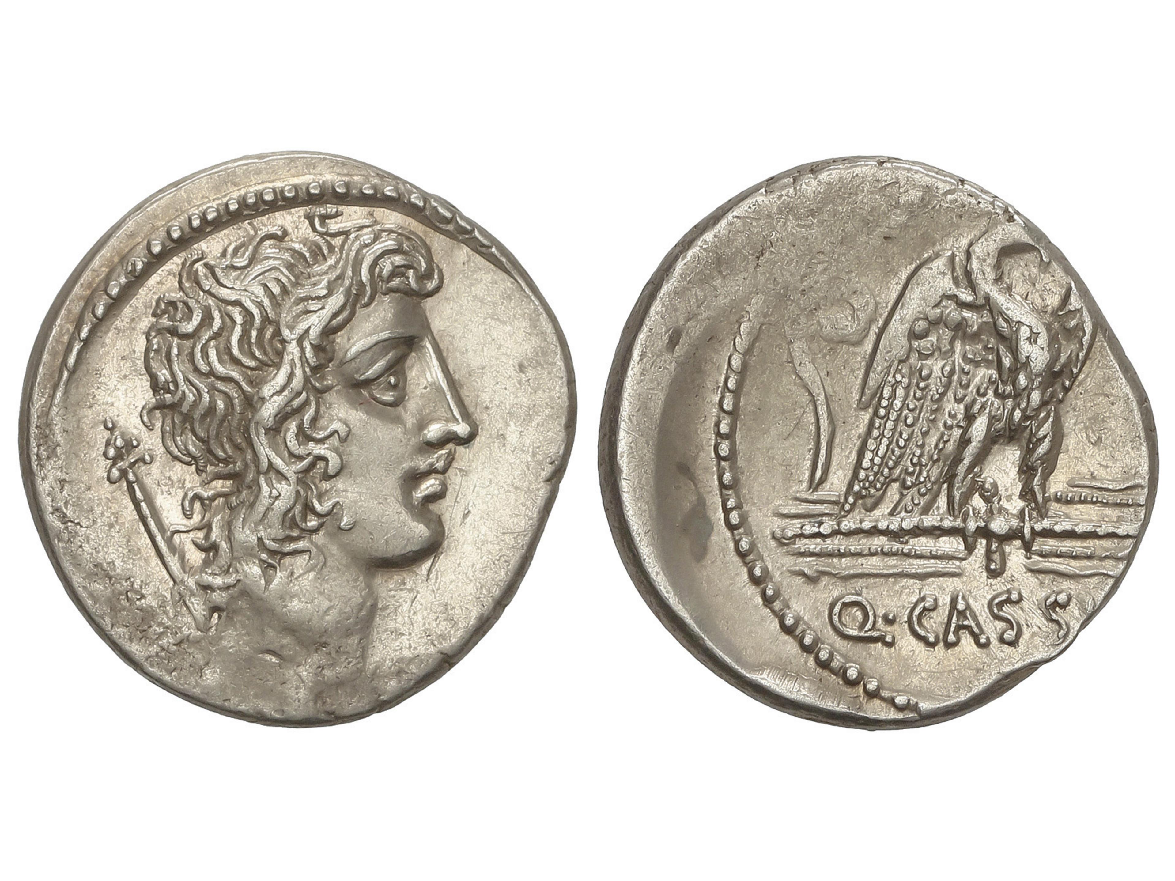 Denario. 55 a.C. CASSIA. Q. Cassius Longinus. Anv.: Cabeza de Bonus Eventus a derecha, detrás cetro. Rev.: Águila a derecha, entre lituo y praeferículo, debajo Q. CASSIVS. 3,99 grs. AR. Restos de brillo