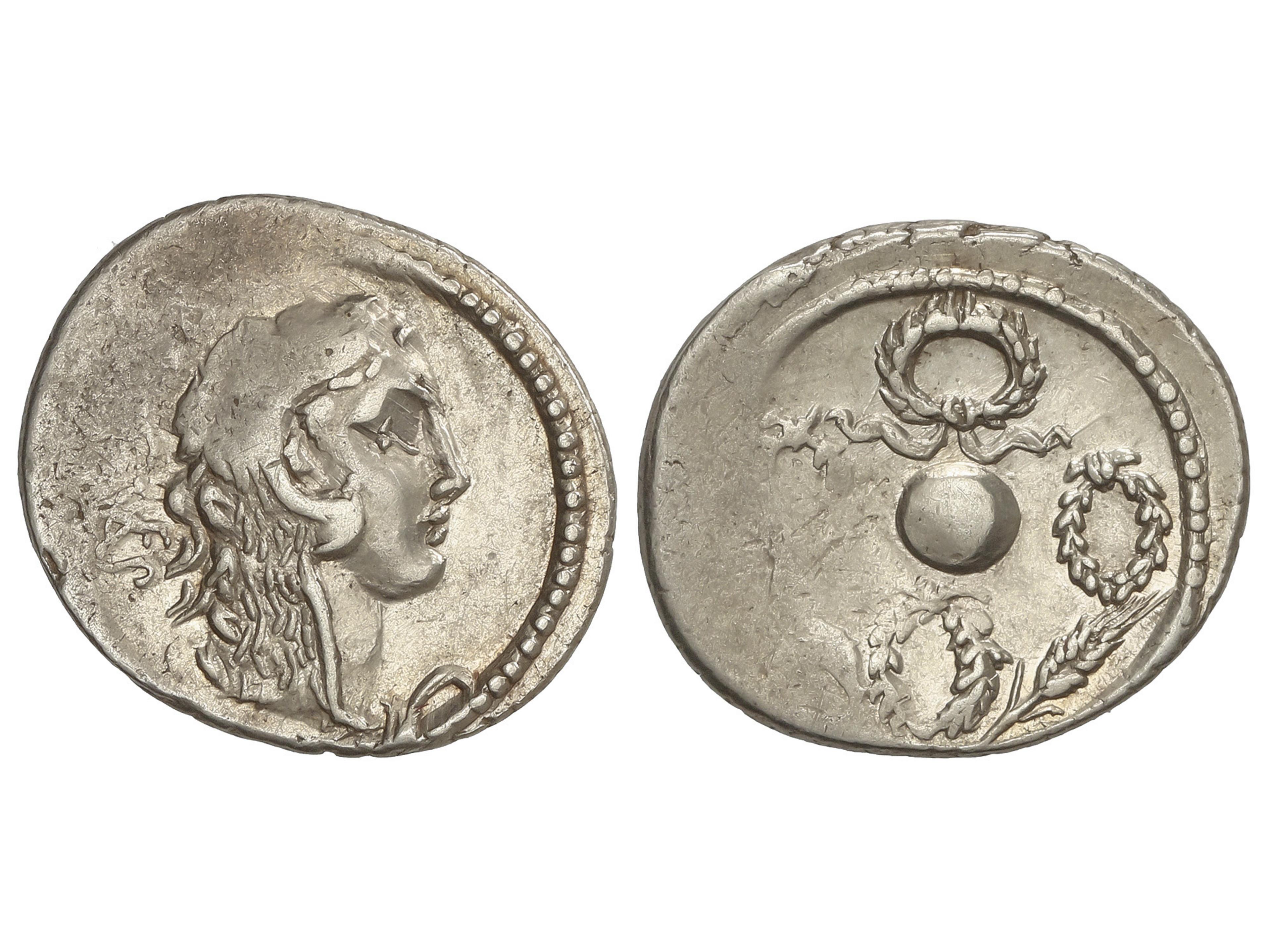 Denario. 56 a.C. CORNELIA. Faustus Cornelius Sulla. Anv.: Cabeza de Hércules con piel de león a derecha, detrás (SC y FAVST). Rev.: Globo terrestre entre cuatro coronas. 3,96 grs. AR. Acuñación floja en parte.