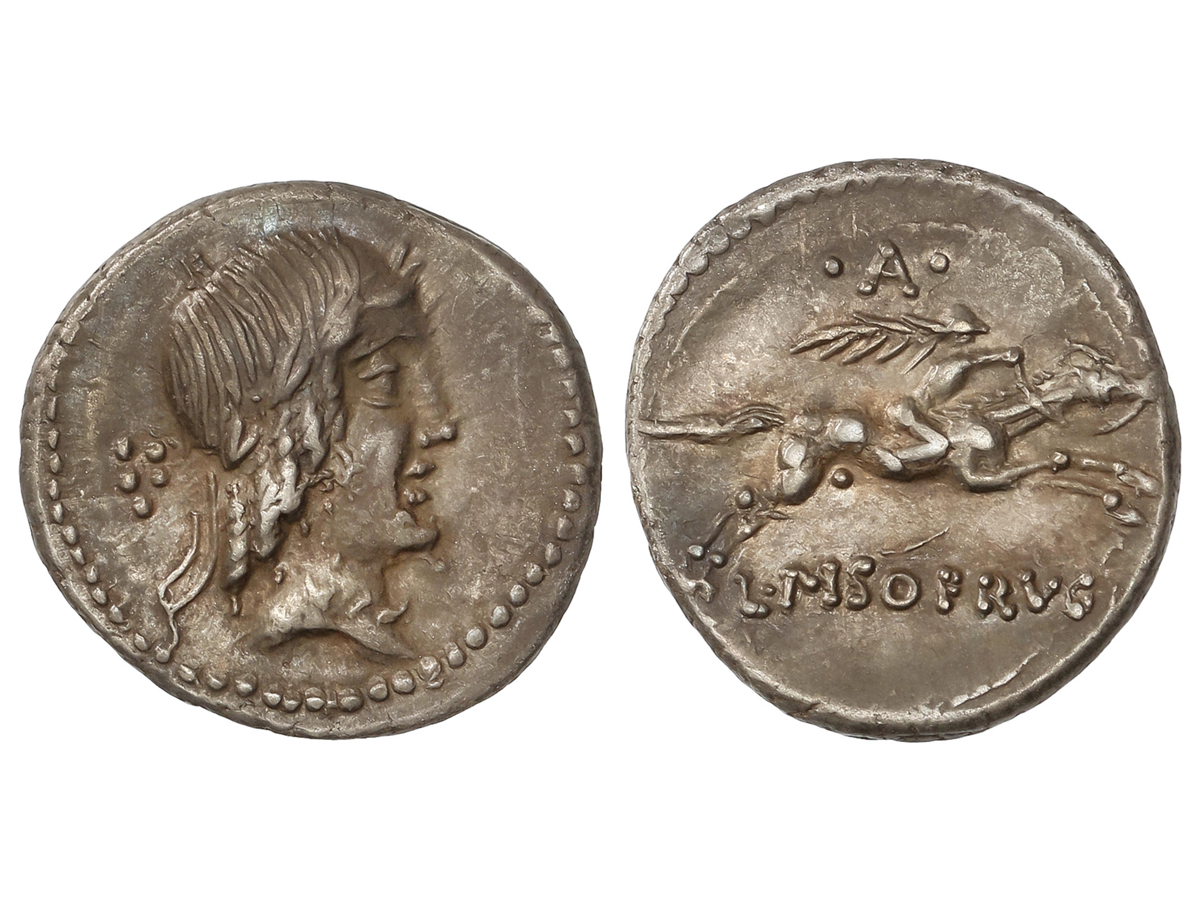 Denario. 90-89 a.C. CALPURNIA. L. Calpurnius Piso Frugi. Anv.: Cabeza laureada de Apolo a derecha, detrás signo fraccionario de 5 puntos. Rev.: Jinete galopando a derecha, encima letra A entre puntos, debajo L.