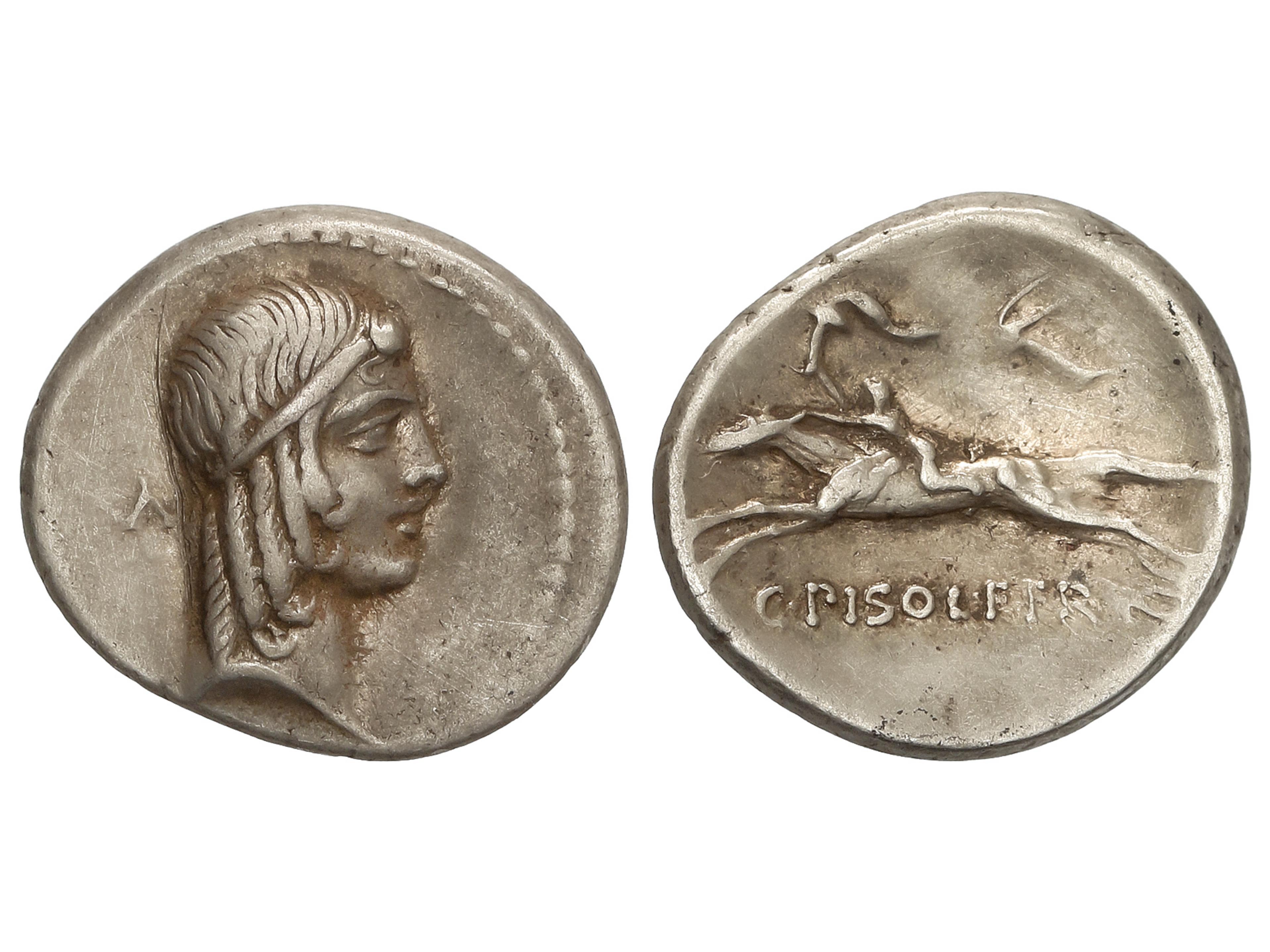 Denario. 64 a.C. CALPURNIA. C. Calpurnius Piso Frugi. Anv.: Cabeza diademada de Apolo a derecha, detrás símbolo. Rev.: Jinete galopando a derecha, encima signo fraccionario, debajo C. PISO. L.F. FRV. 3,93 grs.