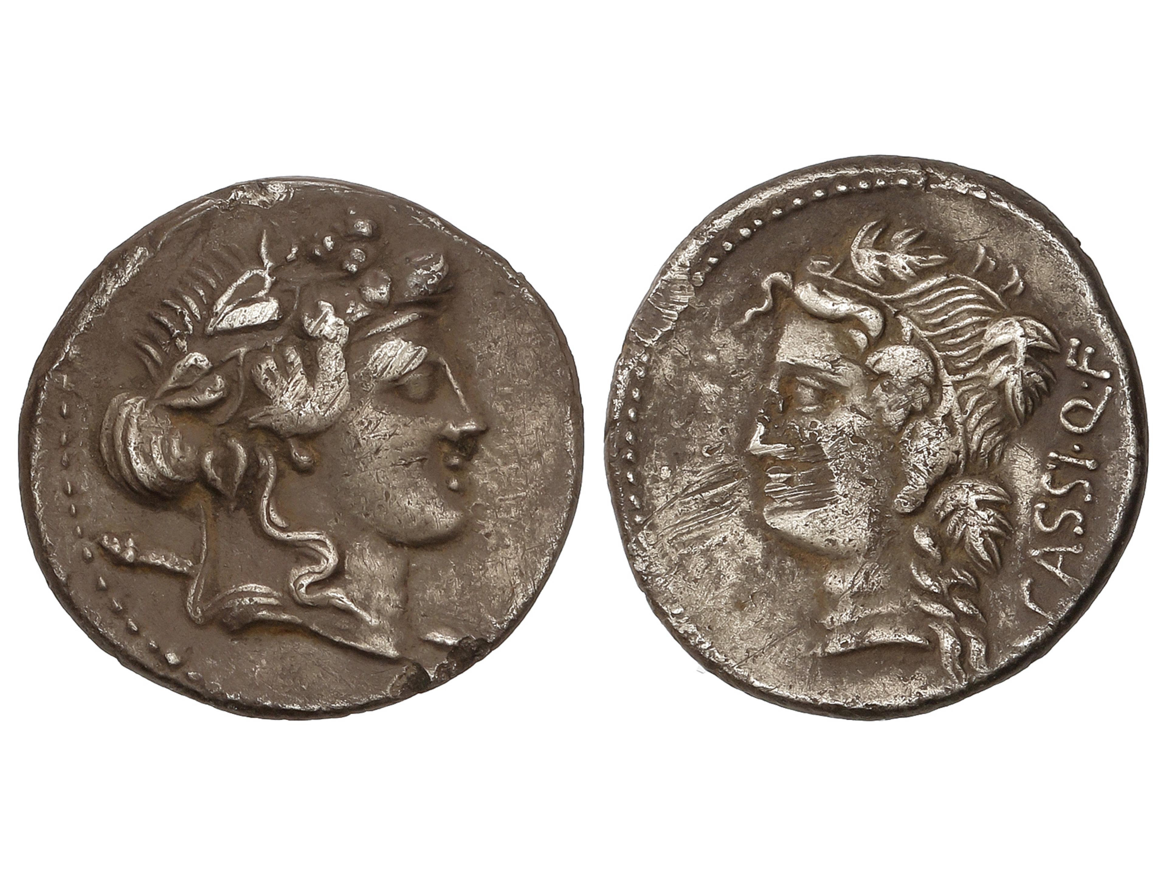 Denario. 78 a.C. CASSIA. L. Cassius Q. F. Longinus. Anv.: Cabeza de Libero Baco a derecha. Rev.: Cabeza diademada de Libera a izquierda, detrás L. CASSI. Q. F. 3,58 grs. AR. (Golpe en reverso, pequeñas