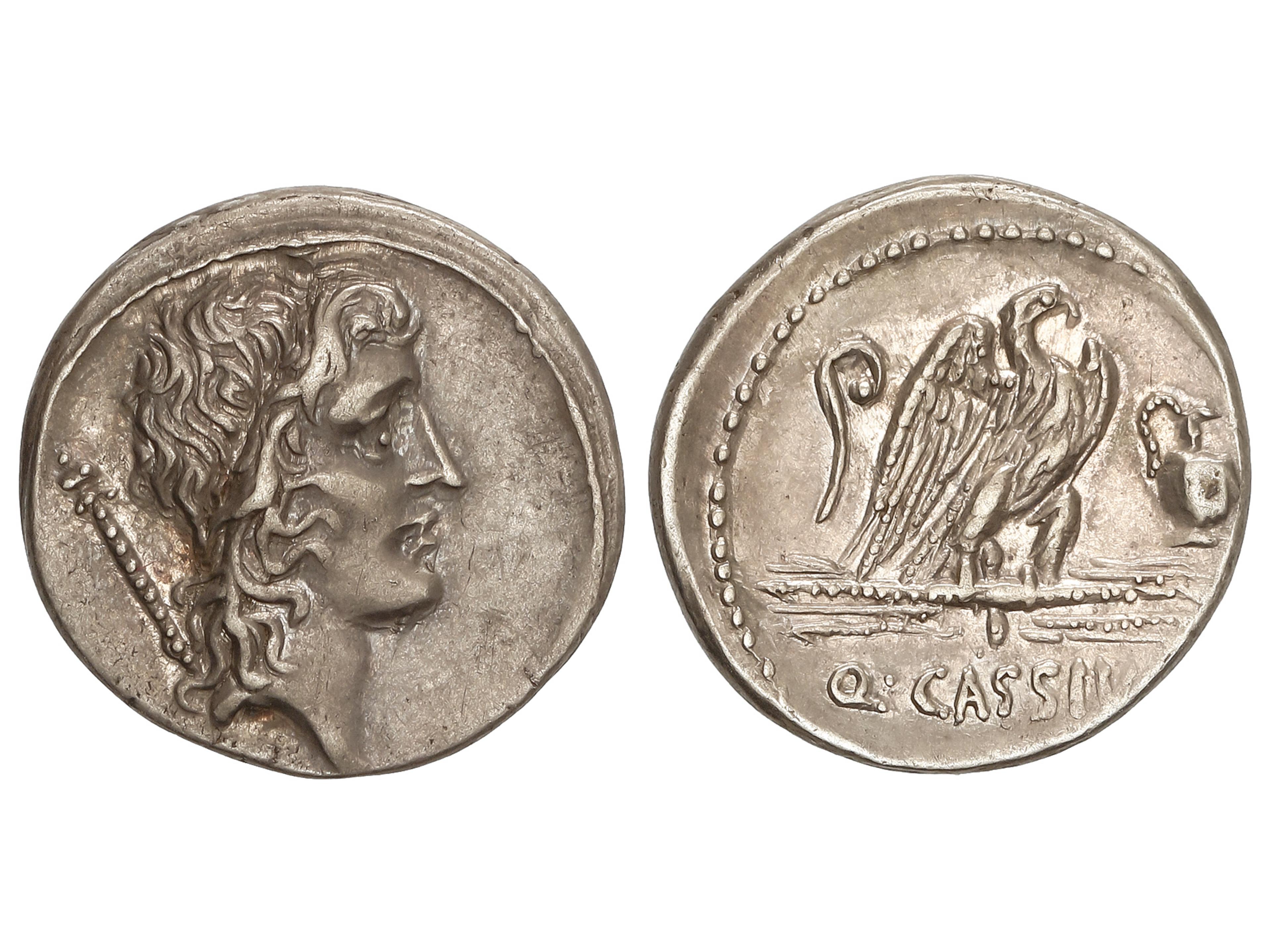 Denario. 55 a.C. CASSIA. Q. Cassius Longinus. Anv.: Cabeza de Bonus Eventus a derecha, detrás cetro. Rev.: Águila a derecha, entre lituo y praeferículo, debajo Q. CASSIVS. 3,91 grs. AR. Acuñación floja en