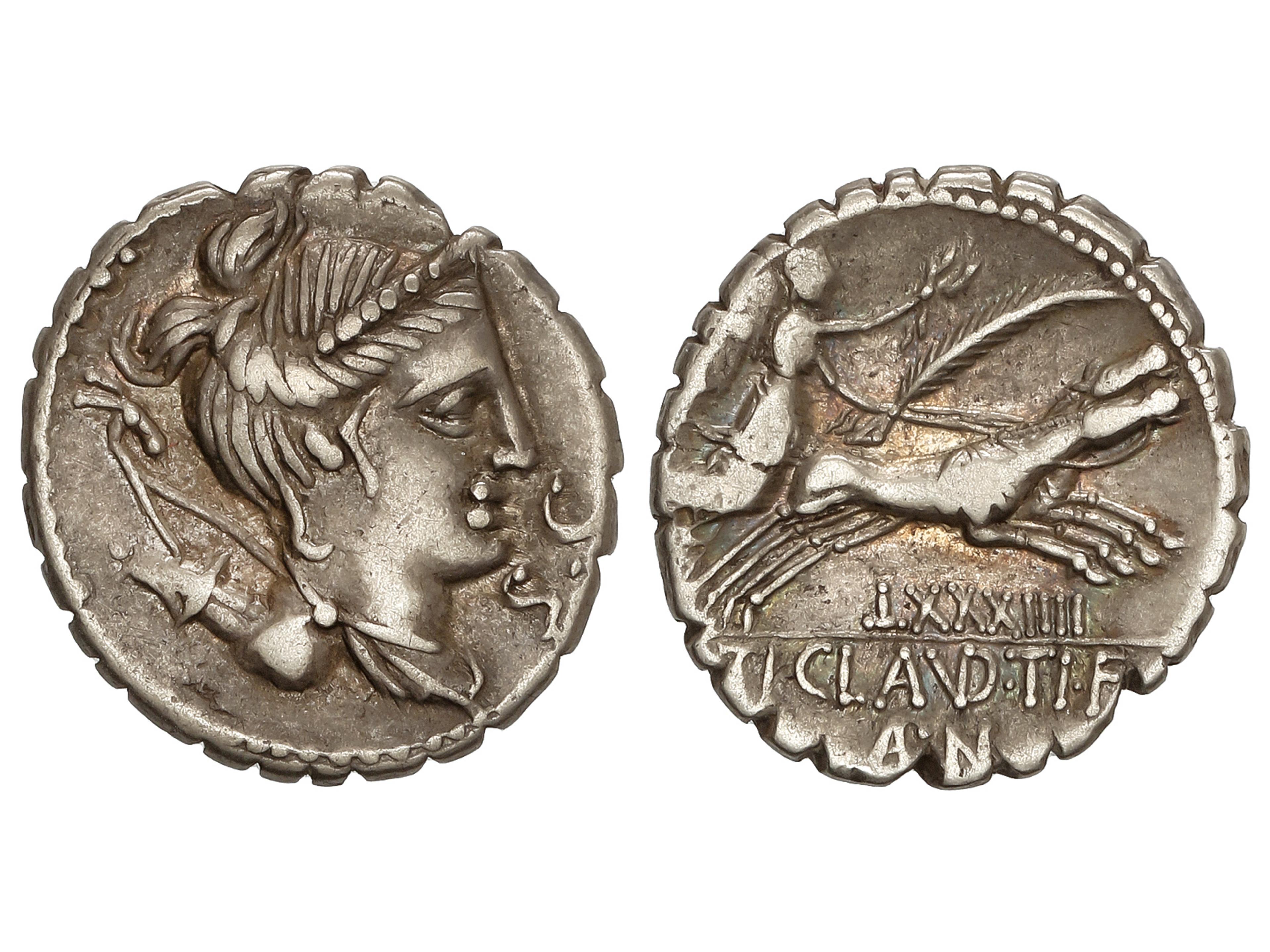Denario. 79 a.C. CLAUDIA. Ti. Claudius Nero. Anv.: Busto diademado de Diana a derecha, entre arco y carcaj y SC delante. Rev.: Victoria en biga a derecha, debajo número LXXXIII. En exergo: TI. CLAVD. TI.F./