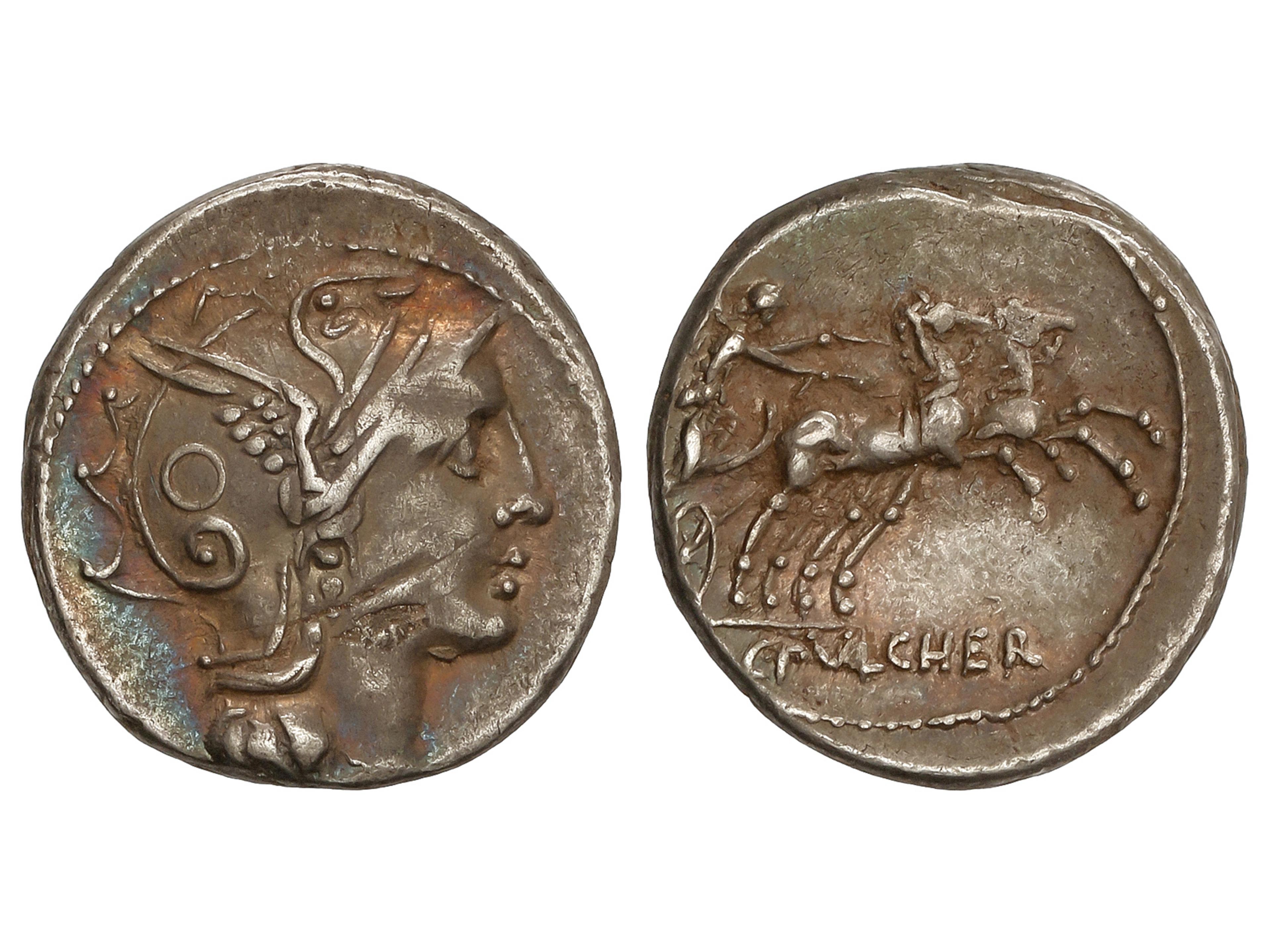 Denario. 110-109 a.C. CLAUDIA. C. Claudius Pulcher. Anv.: Cabeza de Roma a derecha. Rev.: Victoria en biga a derecha. En exergo: C. PVLCHER. 4,02 grs. AR. (Golpecito en anverso). Pátina. BMC-1288; Cal-424;