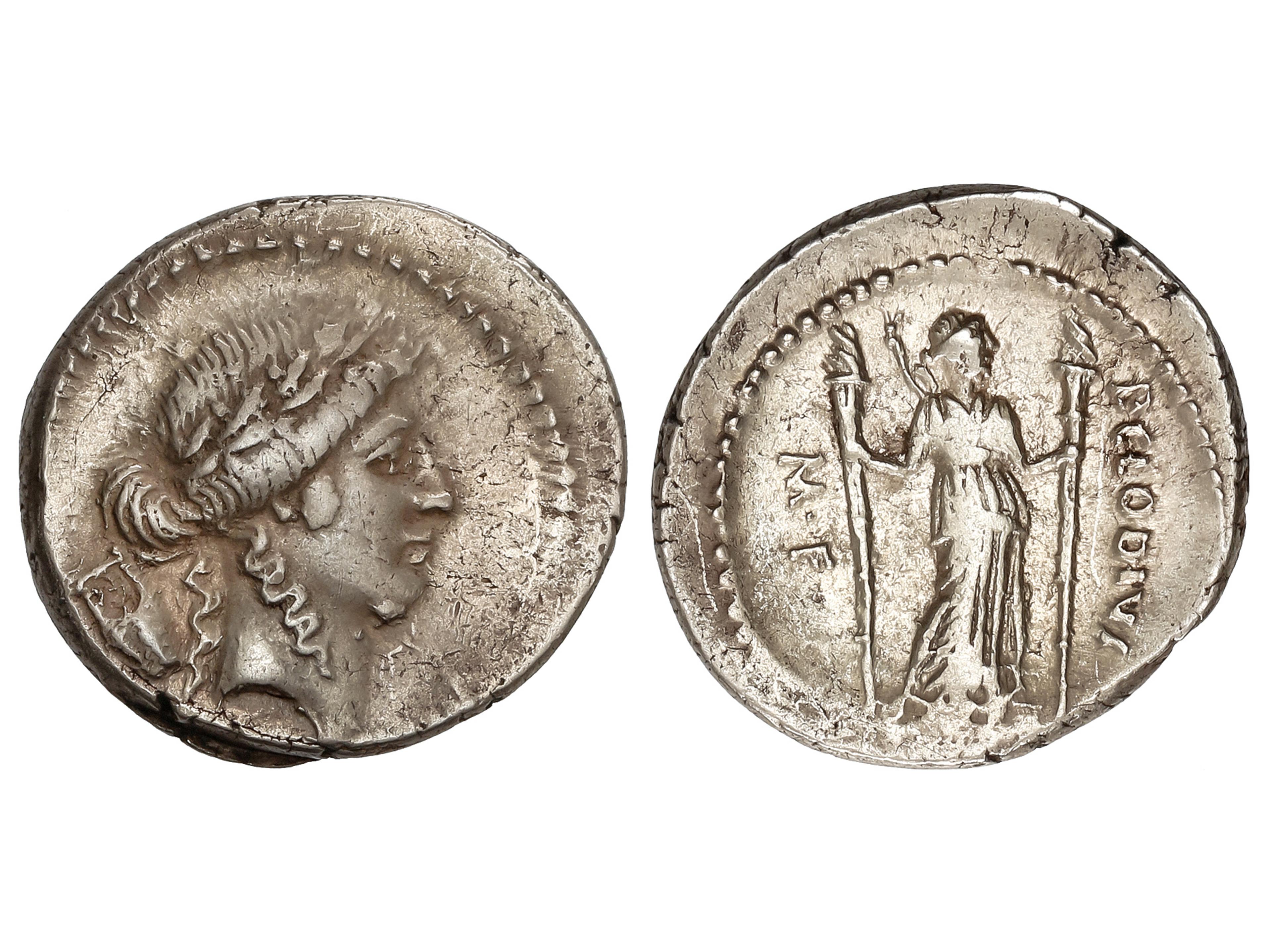 Denario. 42 a.C. CLAUDIA. P. Claudius M. f. Turrinus. Anv.: Cabeza laureada de Apolo a derecha, detrás lira. Rev.: Diana Lucifera de pie con dos largas antorchas. P. CLODIVS M.F. 4,05 grs. AR. Restos de brillo