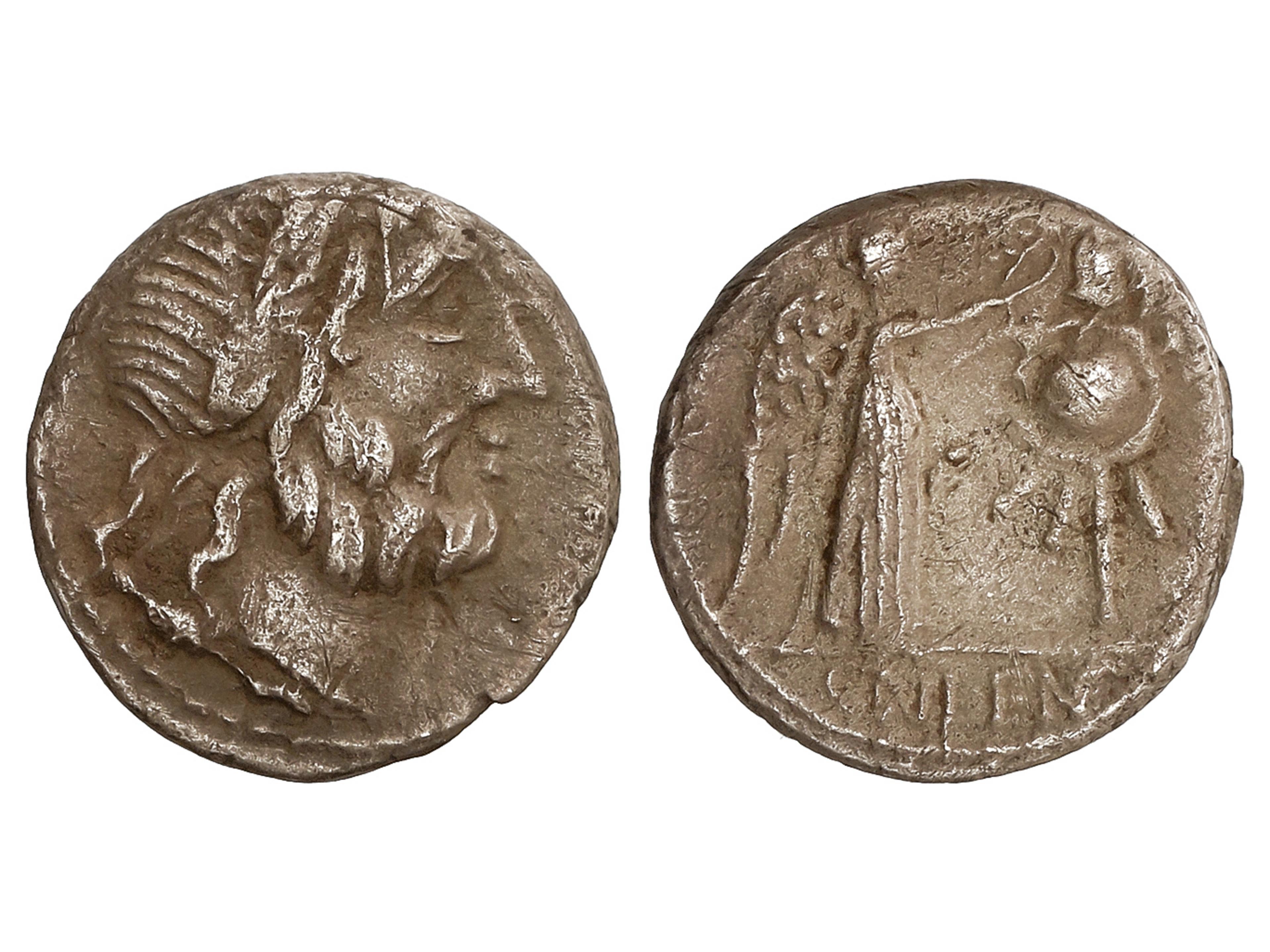 Quinario. 88 a.C. CORNELIA. Cn. Cornelius Lentuluis. Anv.: Cabeza laureada de Júpiter a derecha. Rev.: Victoria en pie a derecha coronando un trofeo. En exergo: CN. LENT. 1,84 grs. AR. Pátina. Se-255.