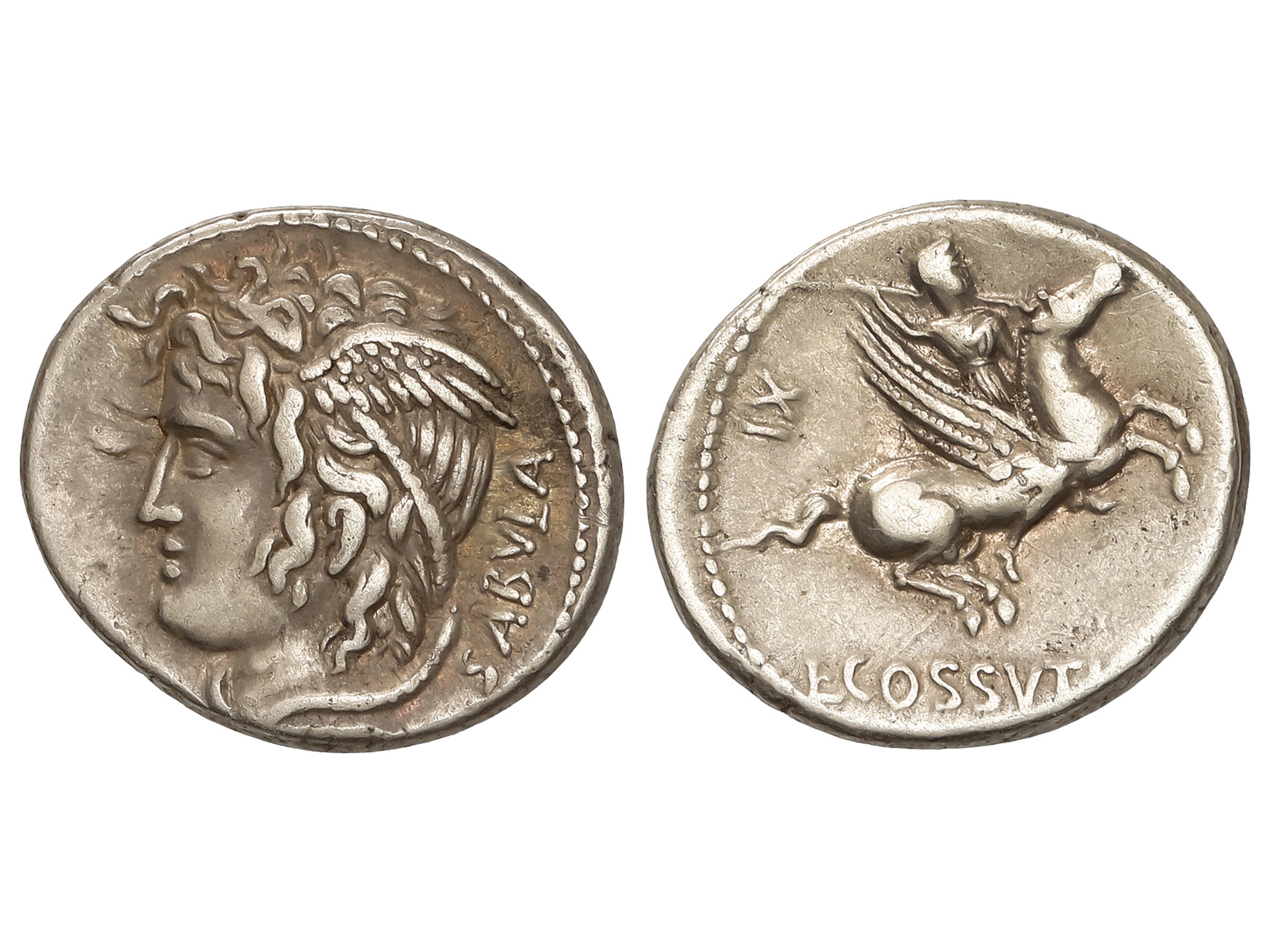 Denario. 74 a.C. COSSUTIA. L. Cossutius C.f Sabula. Anv.: Cabeza alada de Medusa a izquierda, detrás SABVLA. Rev.: Ballerophon montando Pegaso a derecha, a izquierda número XI, debajo L. COSSVTI. (C.F.). 3,79