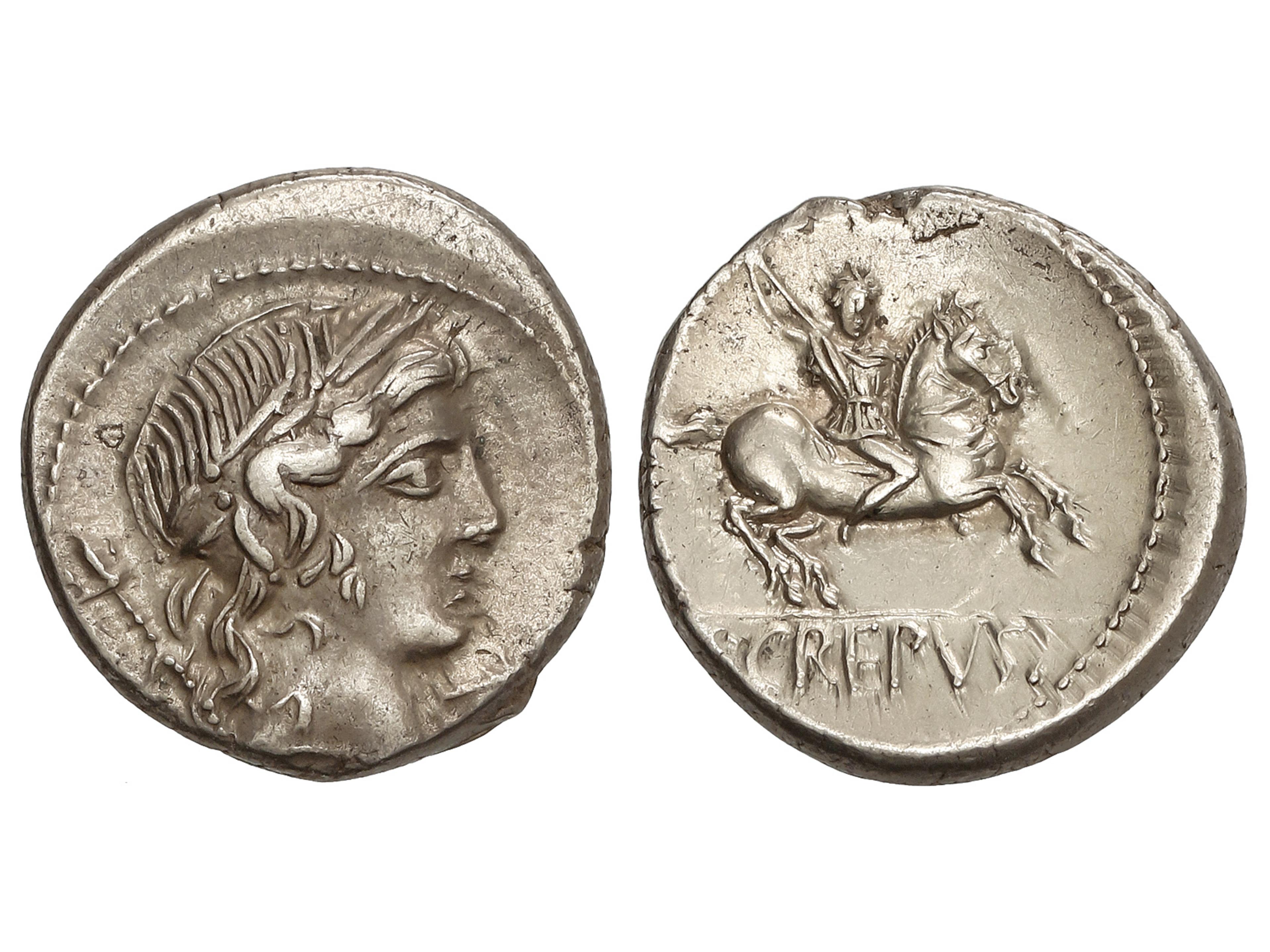 Denario. 82 a.C. CREPUSIA. Publius Crepusius. Anv.: Cabeza laureada de Apolo a derecha, delante símbolo, detrás cetro. Rev.: Jinete con lanza a derecha. En exergo: P. CREPVSI. 4,10 grs. AR. BMC-2664-8; Cal-525;