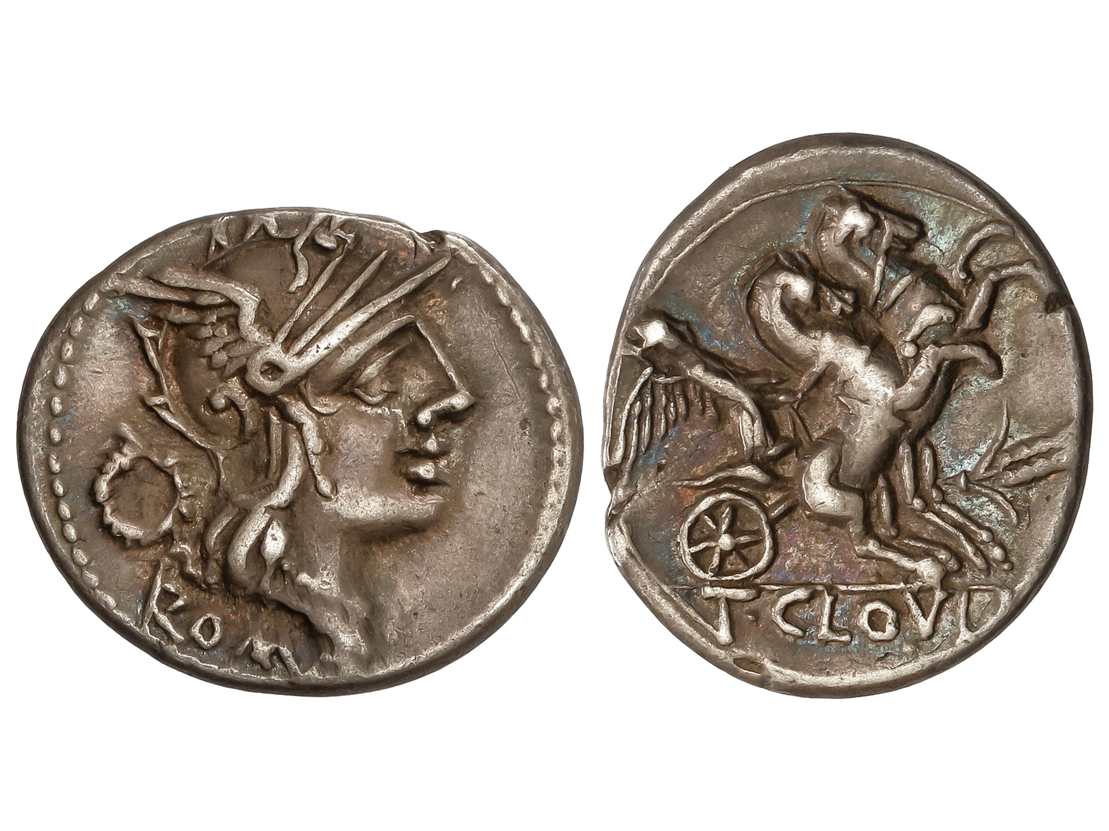 Denario. 128 a.C. CLOULIA. T. Cloelius. Anv.: Cabeza de Roma derecha, detrás corona, debajo ROMA. Rev.: Victoria en biga derecha, debajo espiga, en exergo T.CLOVLI. 3,89 grs. AR. Pátina. BMC-1079; Cal-435;