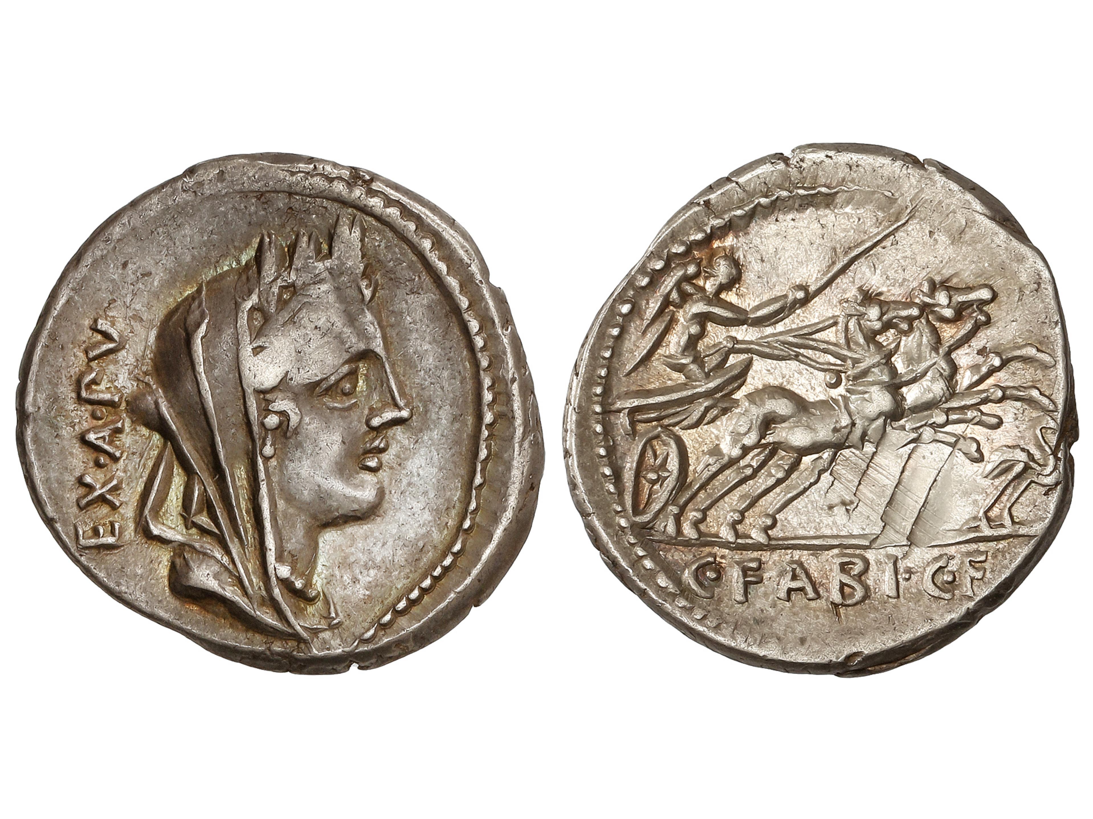 Denario. 104 a.C. FABIA. C. Fabius C.f. Hadrianus. Anv.: Cabeza de Cibeles a derecha, detrás EX. A. PV. Rev.: Victoria en biga a derecha, debajo cigüeña. En exergo: C. FABI. C.F. 3,93 grs. AR. (Defecto