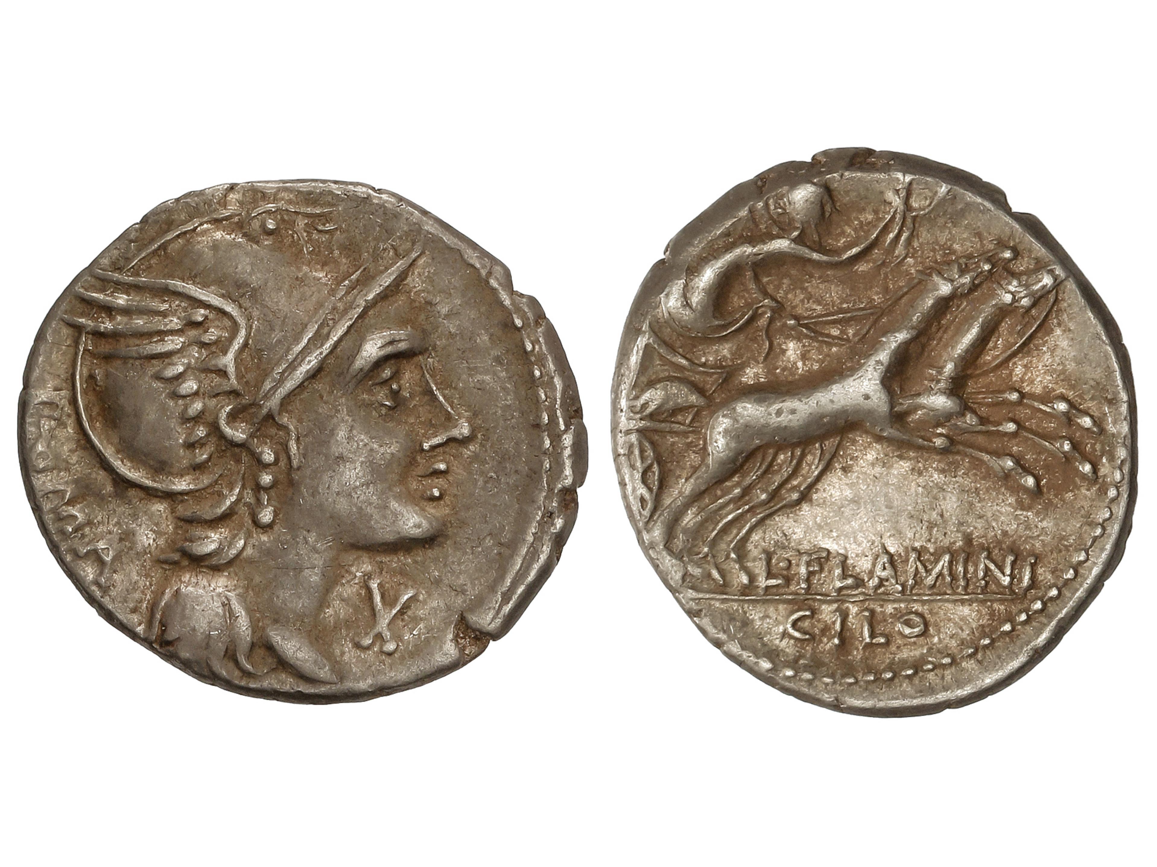 Denario. 109-108 a.C. FLAMINIA. Lucius Flaminius Cilo. Anv.: Cabeza de Roma entre ROMA y X. Rev.: Victoria en biga a derecha, debajo L.FLAMINI, en exergo CILO. 3,88 grs. AR. Ligera pátina. BMC-537; Cal-579;