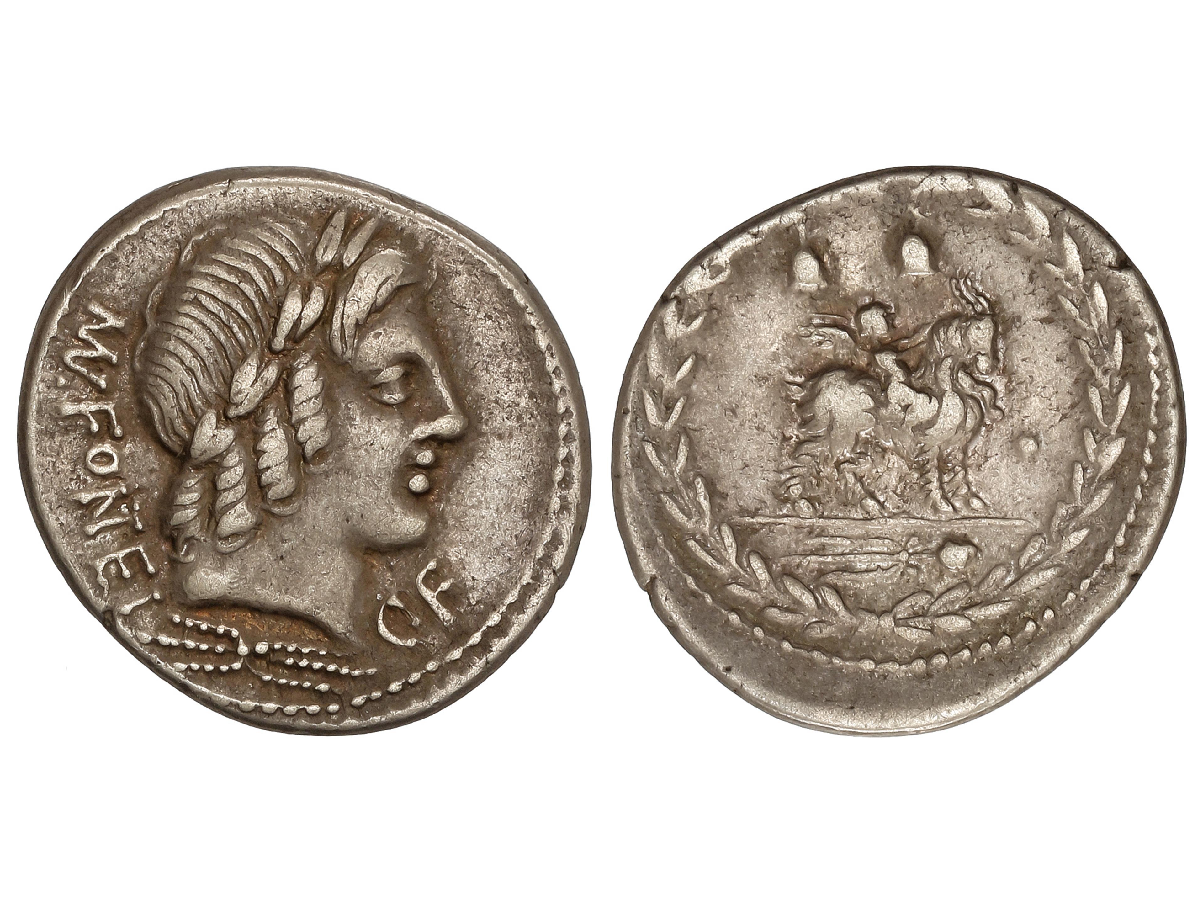 Denario. 85 a.C. FONTEIA. Mn. Fonteius. C.F. Anv.: Cabeza de Apolo Vejovis a derecha, entre MN. (nexadas) FONTEI (NT nexadas) y C.F. Rev.: Genio sobre cabra a derecha, debajo tirso, todo dentro de corona de