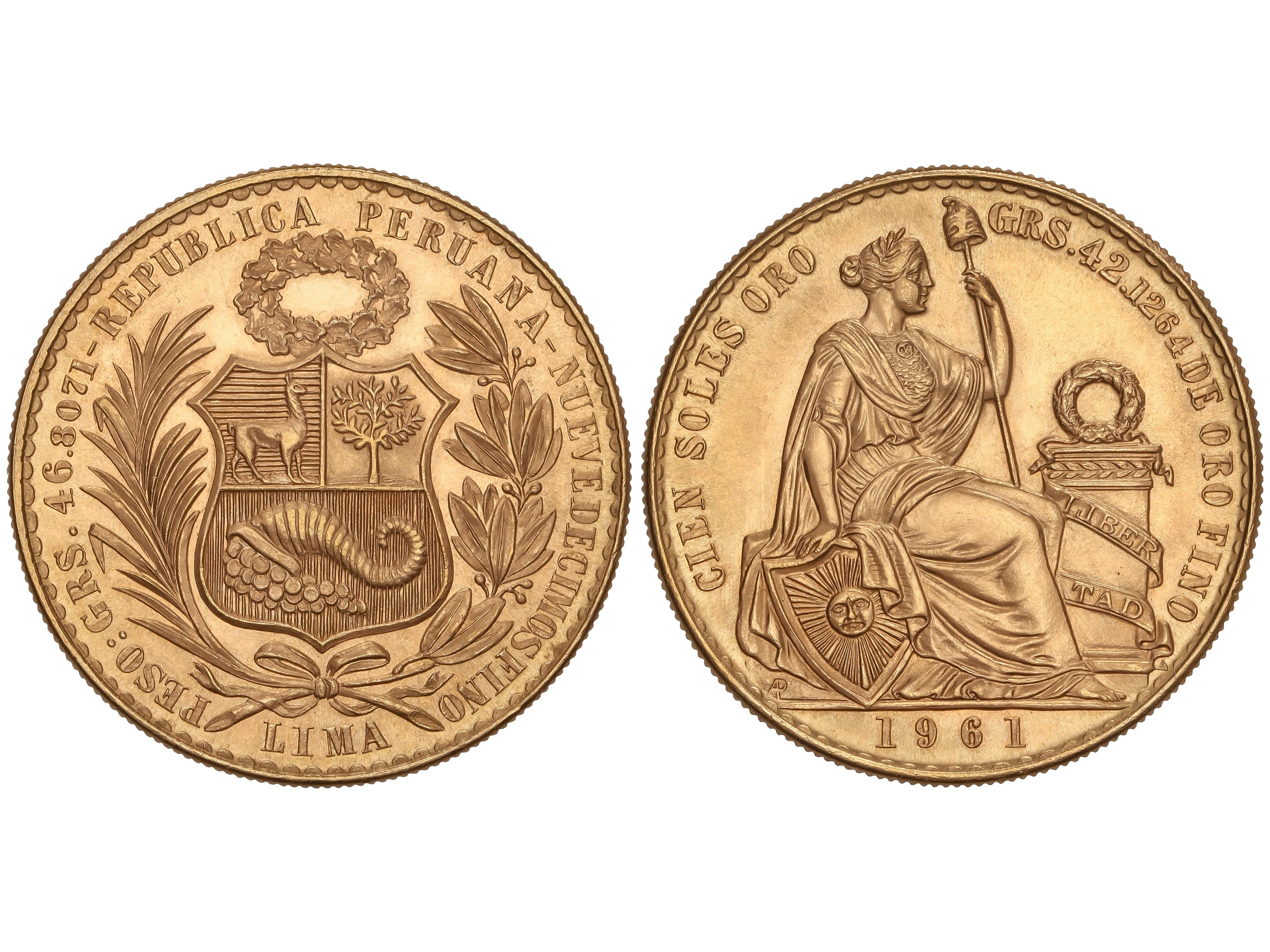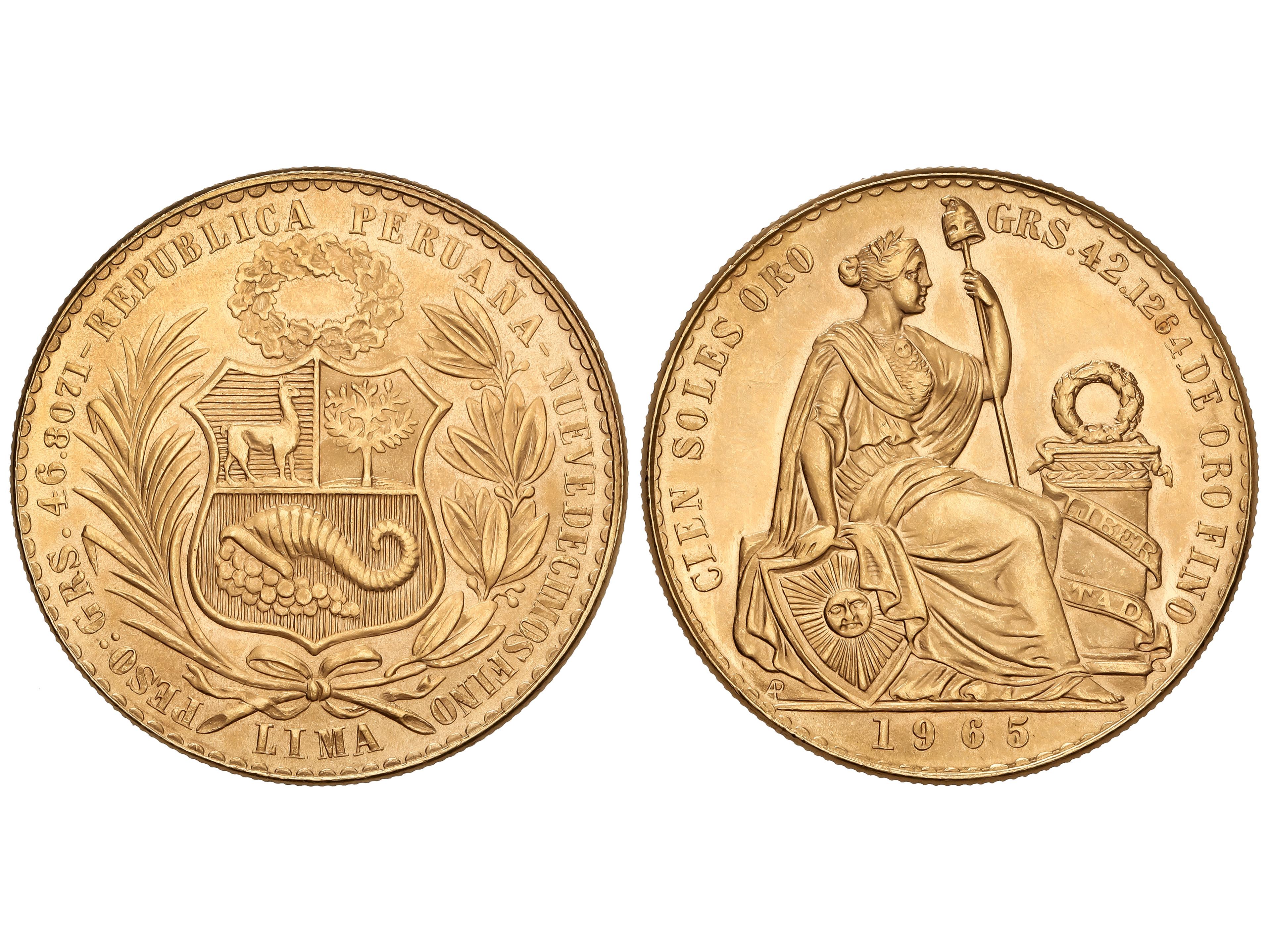 638 image100 Soles. 1965. LIMA. 46,73 grs. AU (900). (Ínfimas marquitas). Pleno brillo original. Fr-78; KM-231. SC-. (Image1)