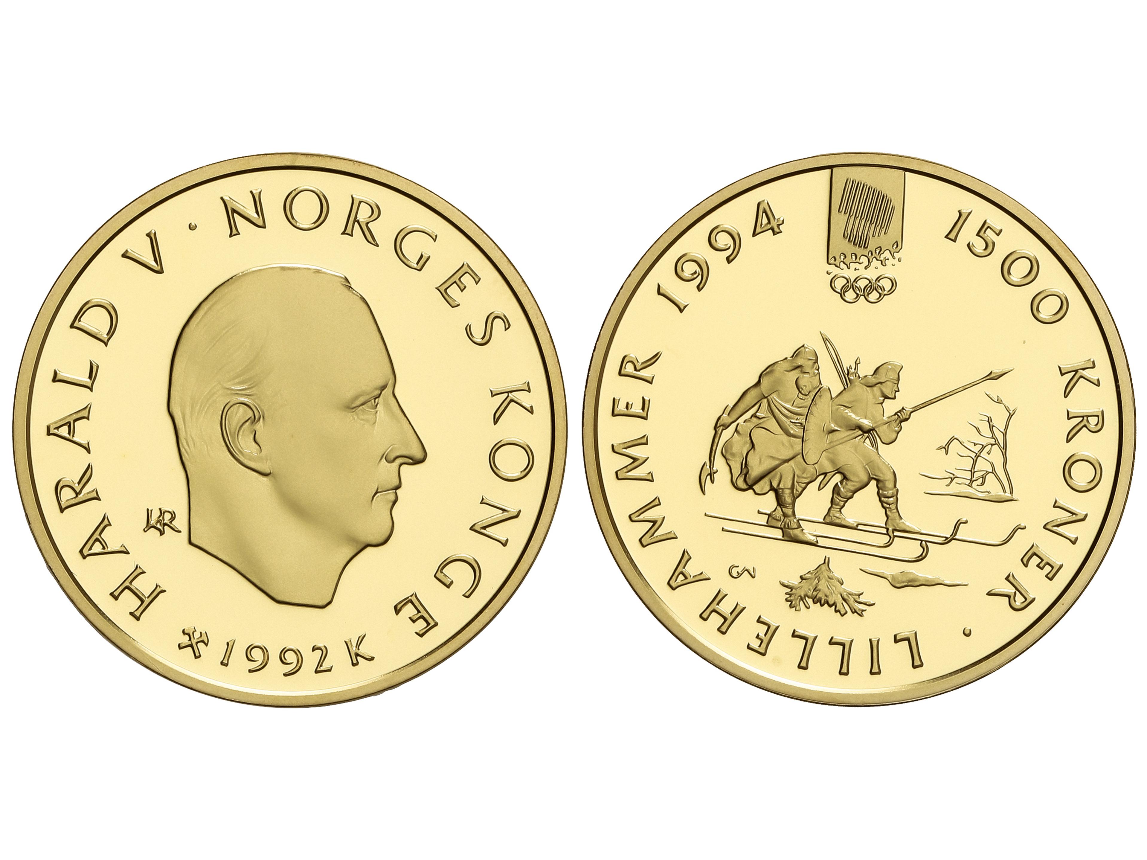 629 image1.500 Kroner. 1992. HARALD V. K. 17,01 grs. AU (917). Olimpiadas Lillehammer´94: Birkebeiners esquiando. (En estuche original, con certificado). Fr-23; KM-442. PROOF. (Image1)
