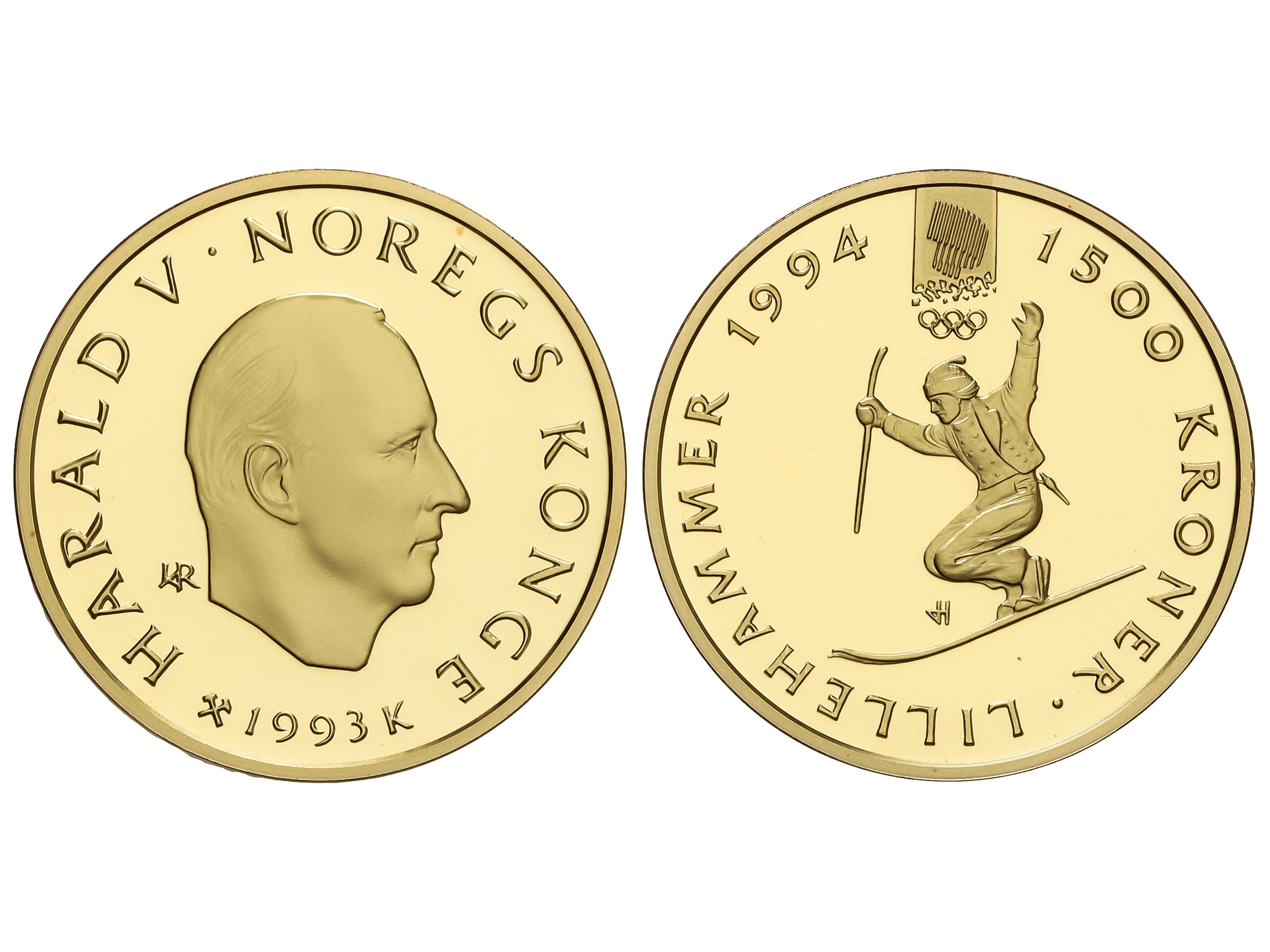 630 image1.500 Kroner. 1993. HARALD V. K. 17,00 grs. AU (917). Olimpiadas Lillehammer´94: Esquiador de Telemark. (En estuche original, con certificado). Fr-24; KM-451. PROOF. (Image1)