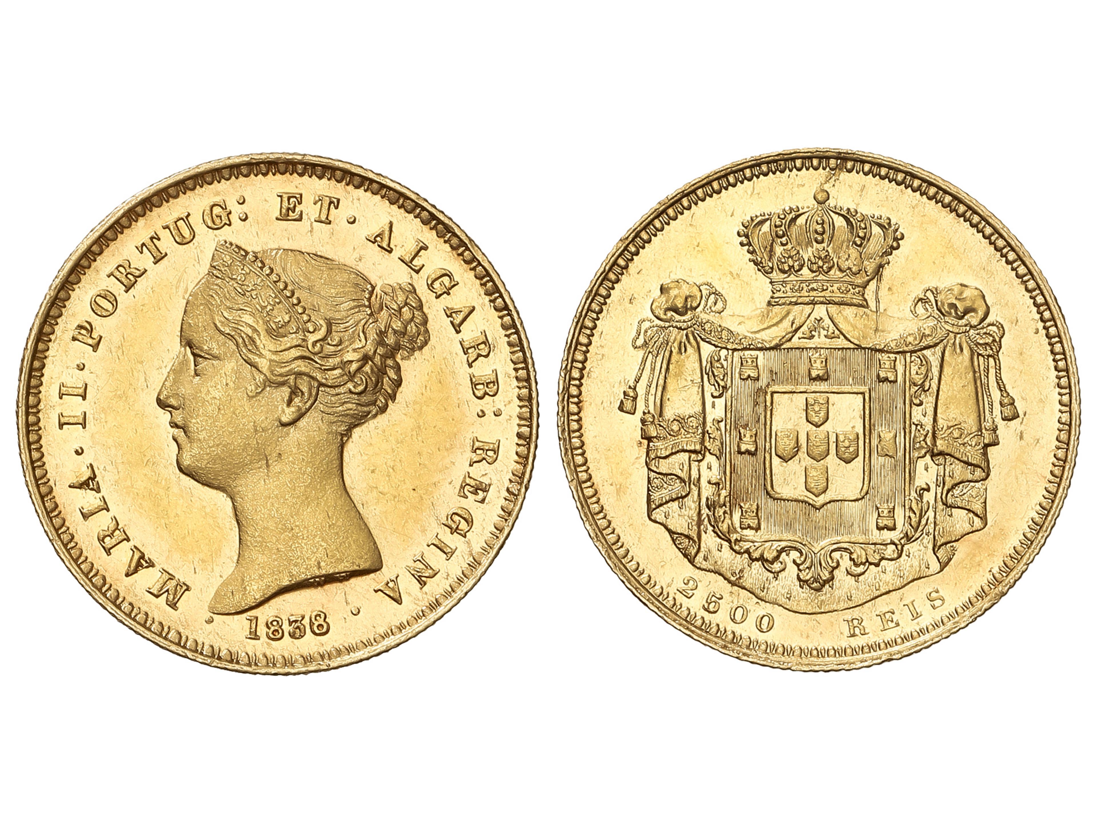 640 image2.500 Reis. 1838. MARIA II. 4,72 grs. AU (917). (Leves golpecitos). Bella con brillo original. RARA Y MÁS ASÍ. Fr-153; KM-475. Tirada: 1.114 piezas. EBC/EBC+. Ex Aureo & Calicó 311 - 31 mayo 2018, n. 865. (Image1)