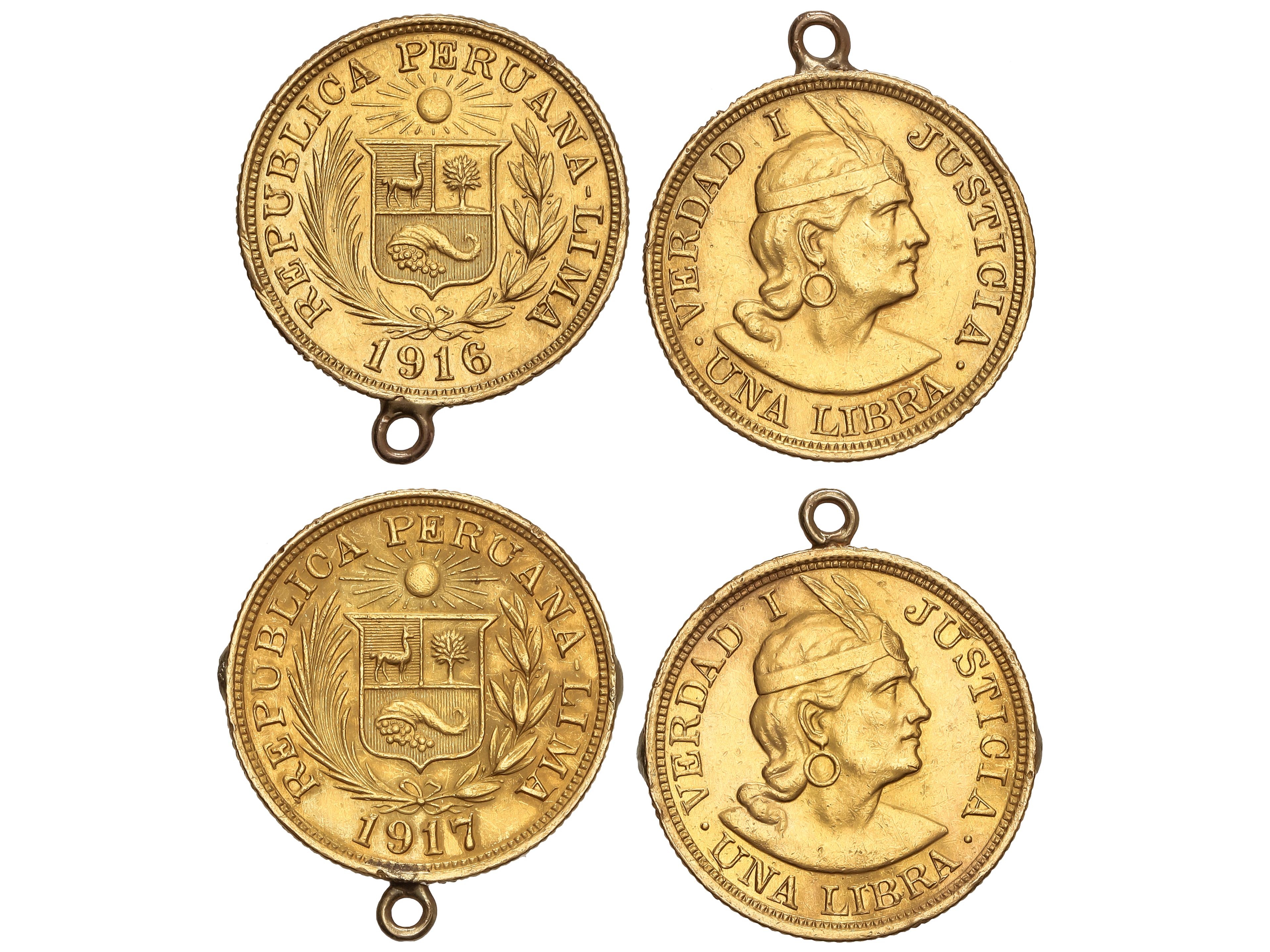 1041 imageLote 2 monedas 1 Libra. 1916 y 1917. LIMA. Peso total 16,04 grs. AU (917). (Con anilla). KM-207. MBC+. (Image1)