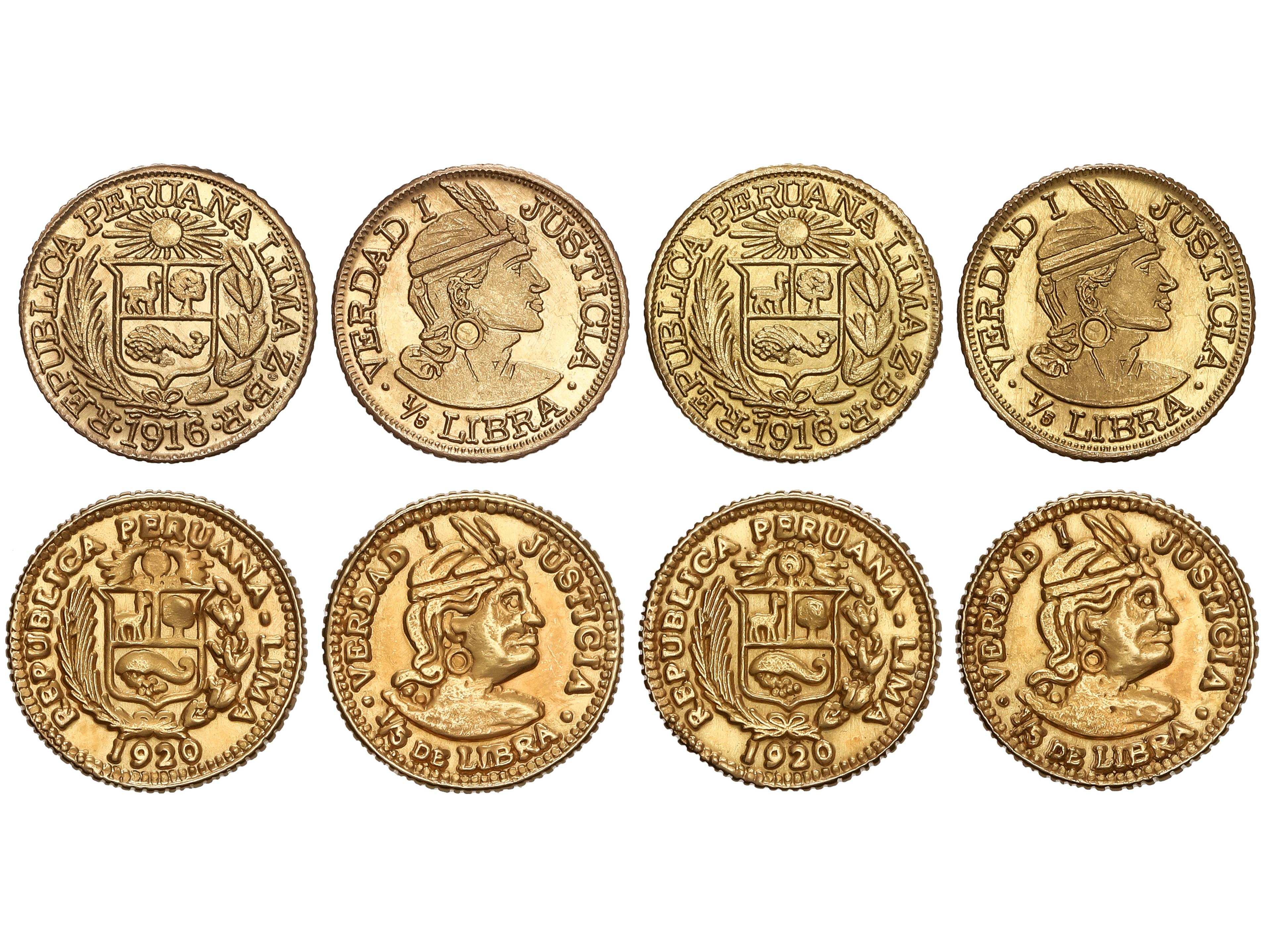 1040 imageLote 4 monedas 1/5 de Libra. 1916 (2) y 1920 (2). LIMA. Peso total 6,42 grs. AU (600 y 800). FALSAS DE ÉPOCA. EBC. (Image1)