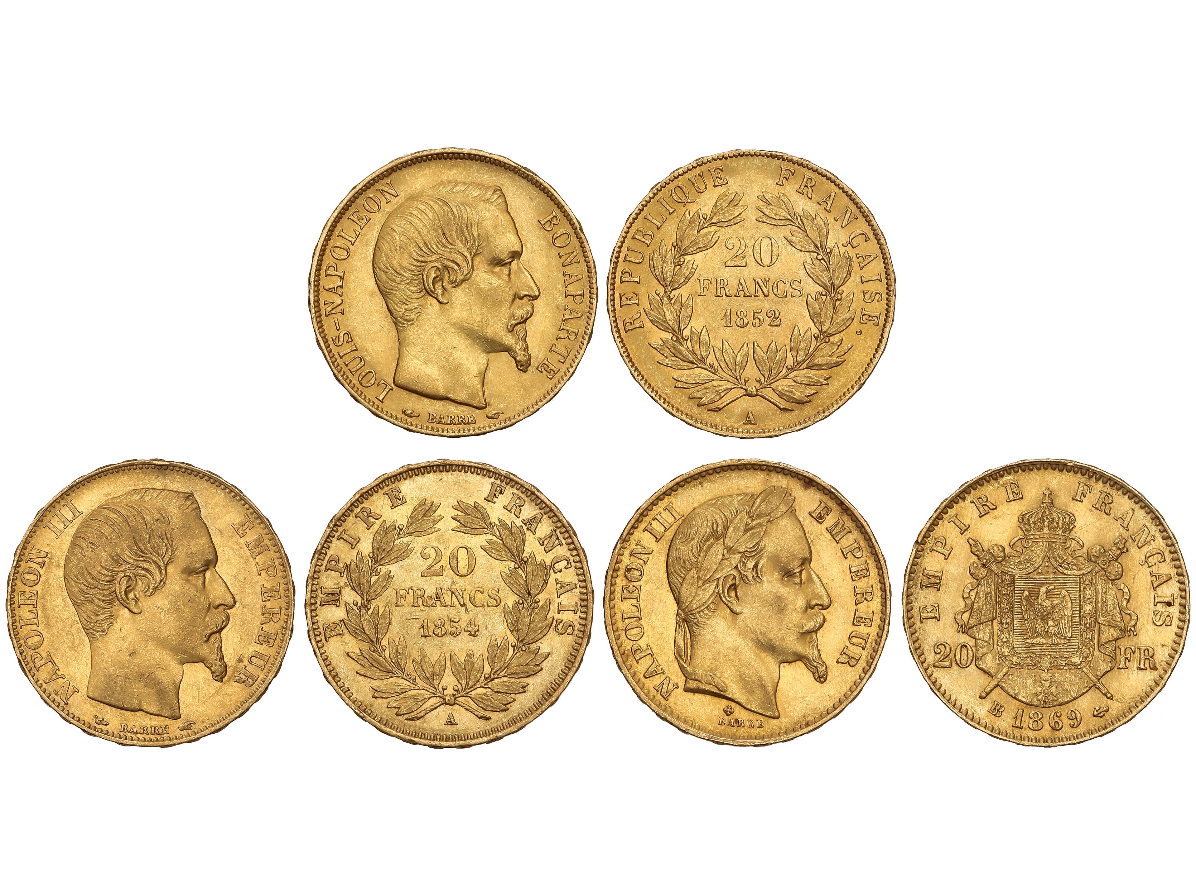 1027 imageLote 3 monedas 20 Francs. 1852-A, 1854-A y 1869-BB. NAPOLEON III y LOUIS NAPOLEON. PARIS (2) y STRASBOURG. Peso total de 19,27 grs. AU (900). Fr-568, 585; KM-774, 801.2. MBC+. (Image1)
