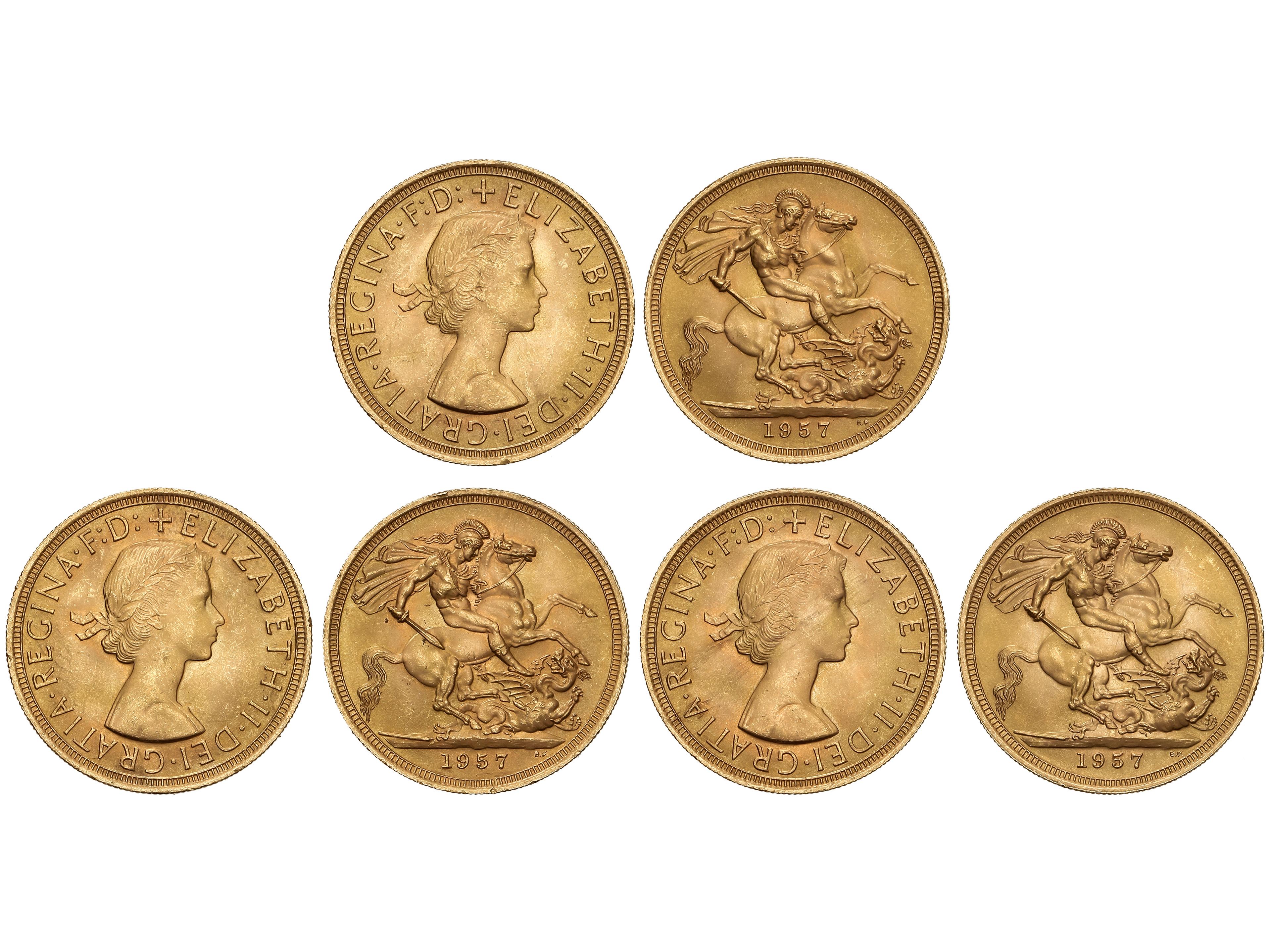 1033 imageLote 3 monedas Sovereign. 1957. ELIZABETH II. Peso total de 23,91 grs. AU (917). Fr-417, KM-908. EBC+ y SC-. (Image1)